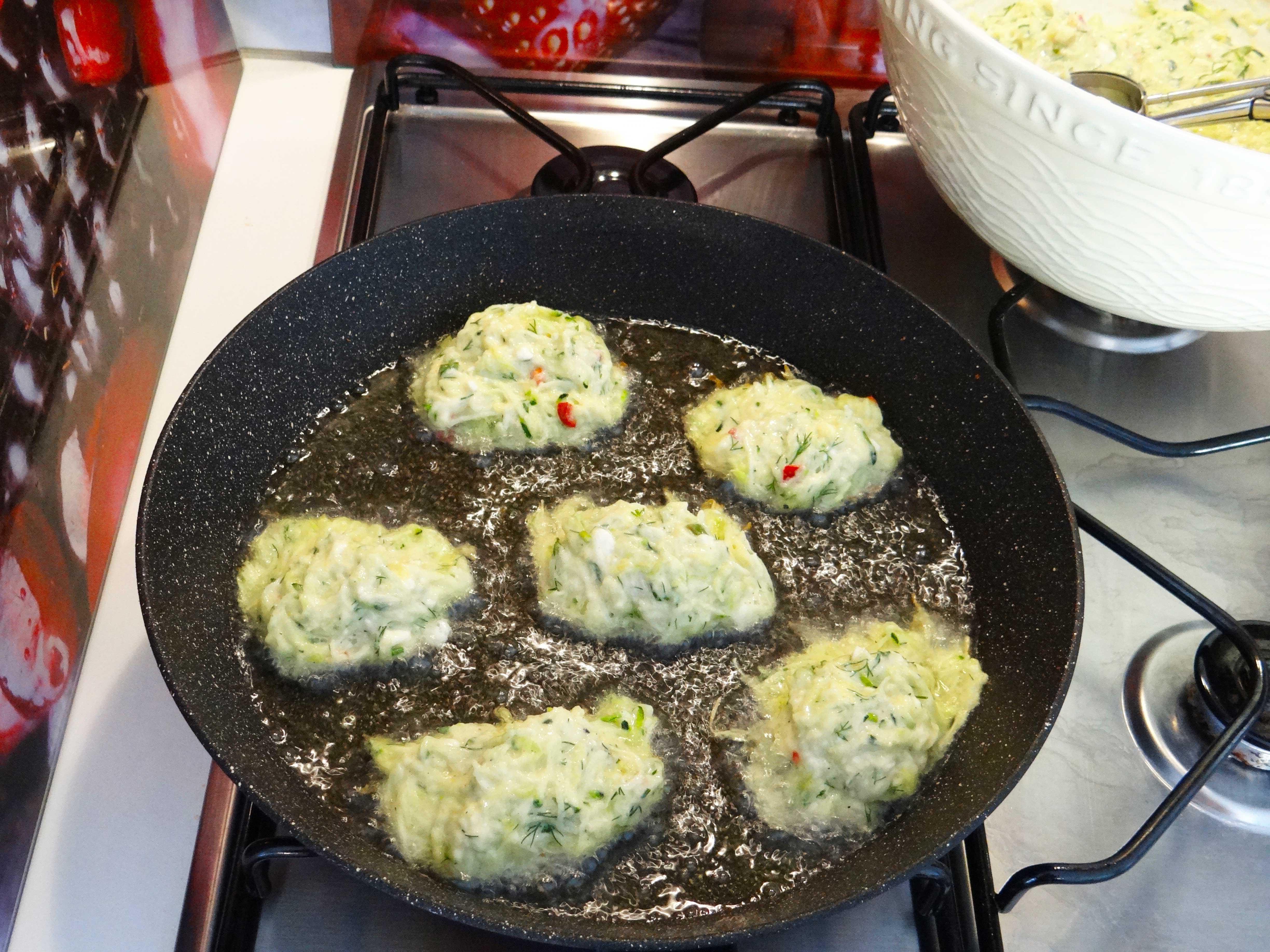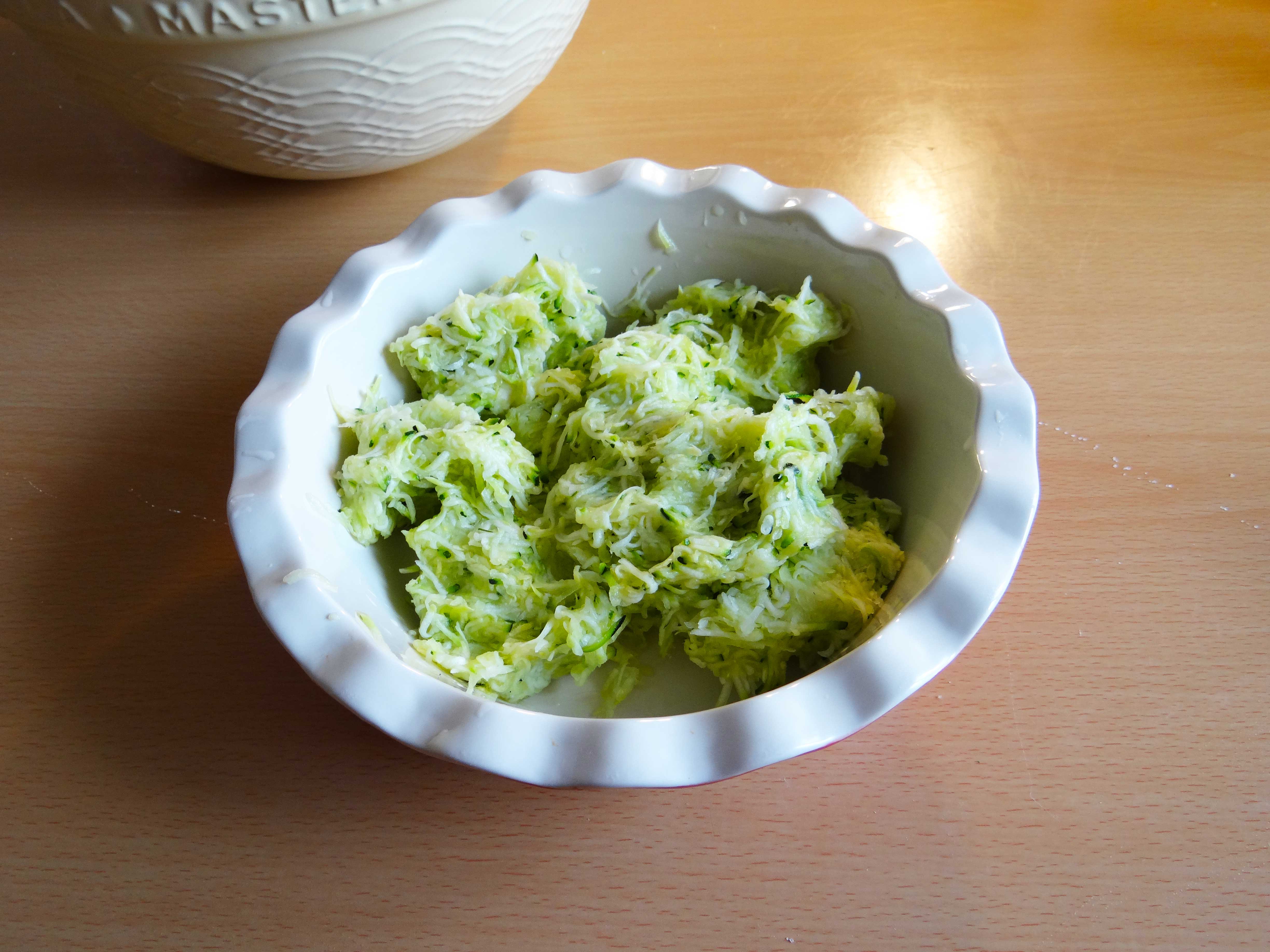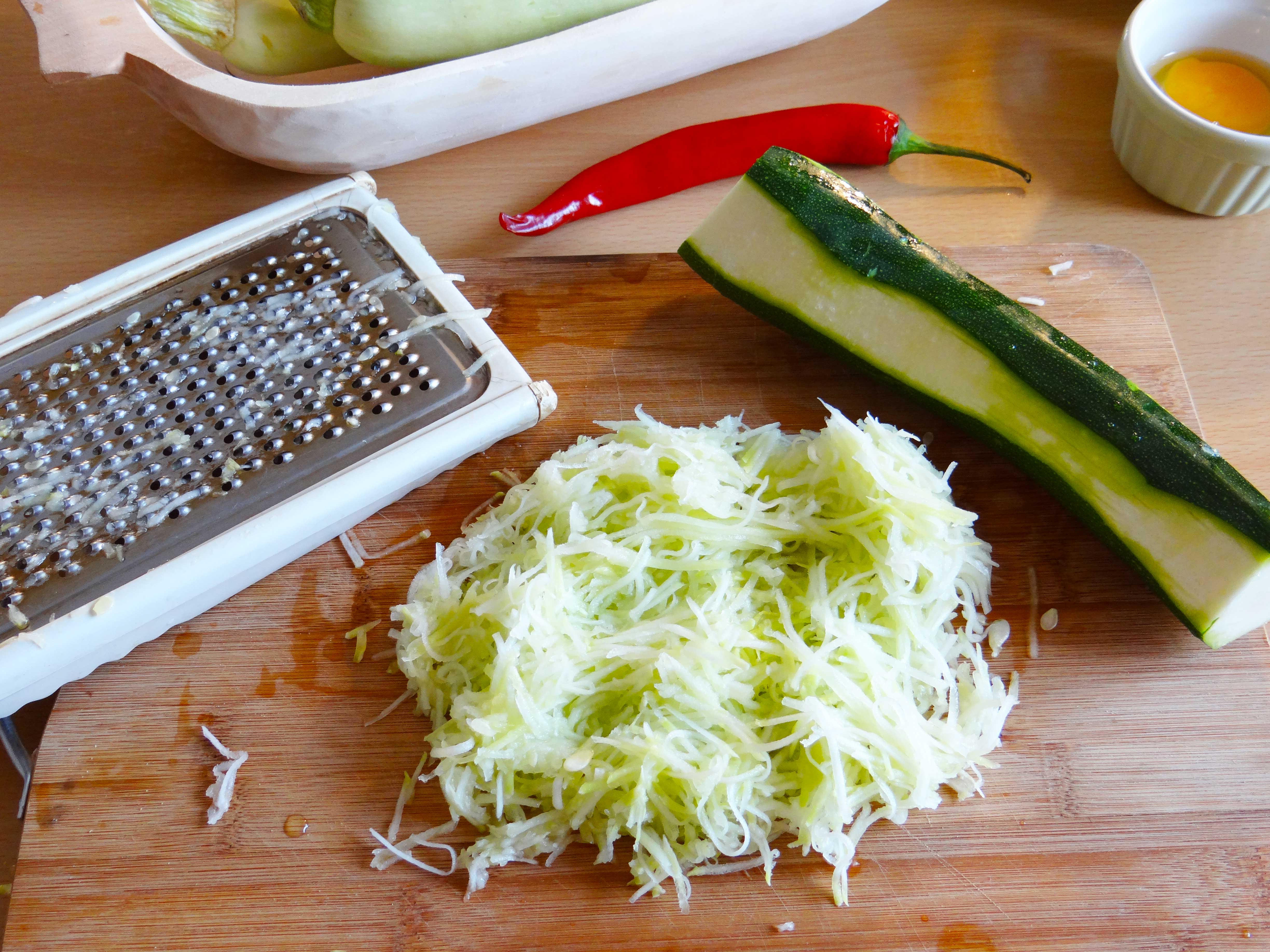 1. Dovleceii bine spalaţi se dau pe razatoarea fina. Se presara cu sare şi se lasă 15 minute sa-si lase apa în exces. Apoi, se storc bine cu mainile sau cu ajutorul unei site.