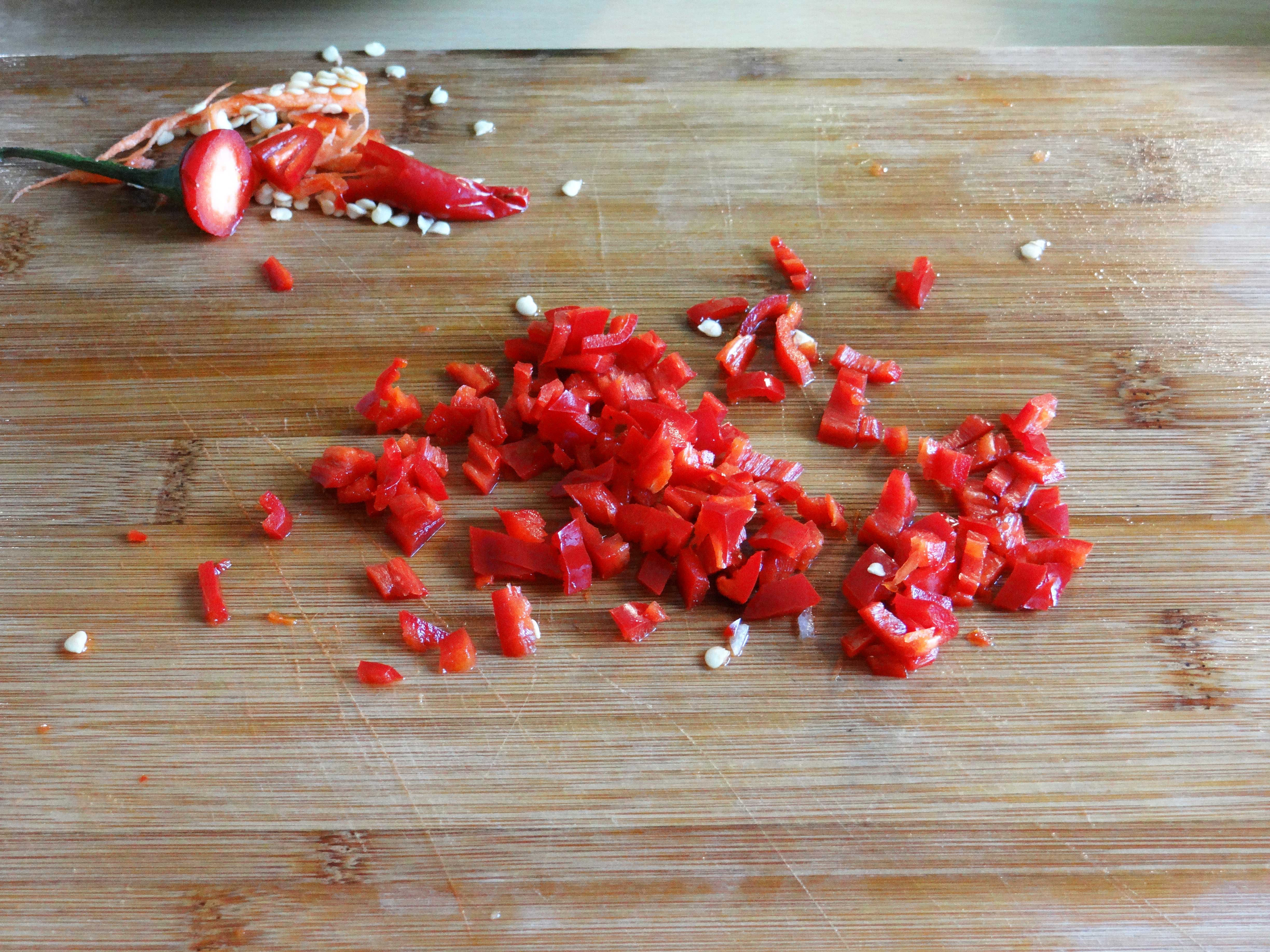 2. Curatam ardeiul iute de seminte si apoi il taiem in bucati mici. Tocam mararul.