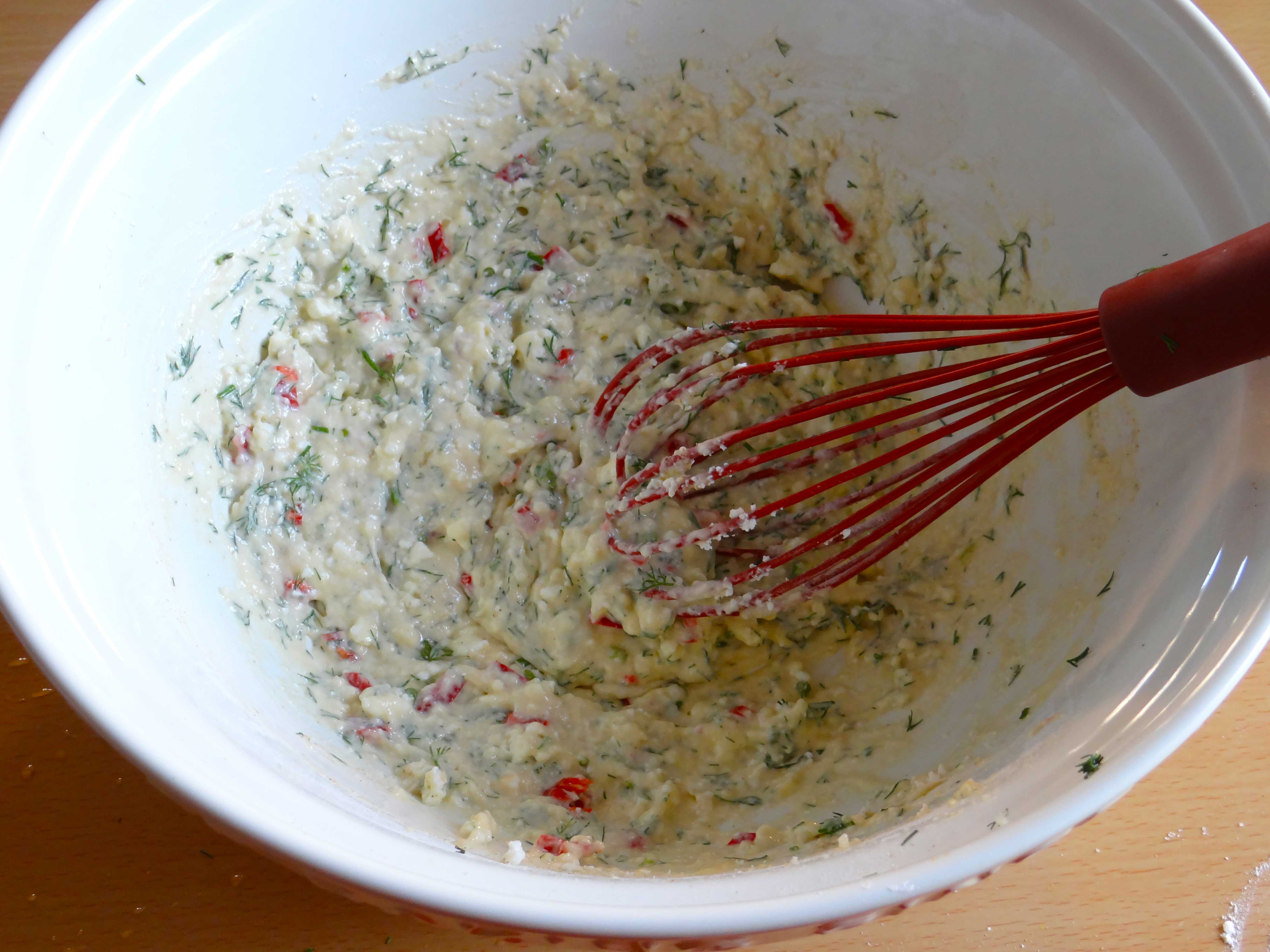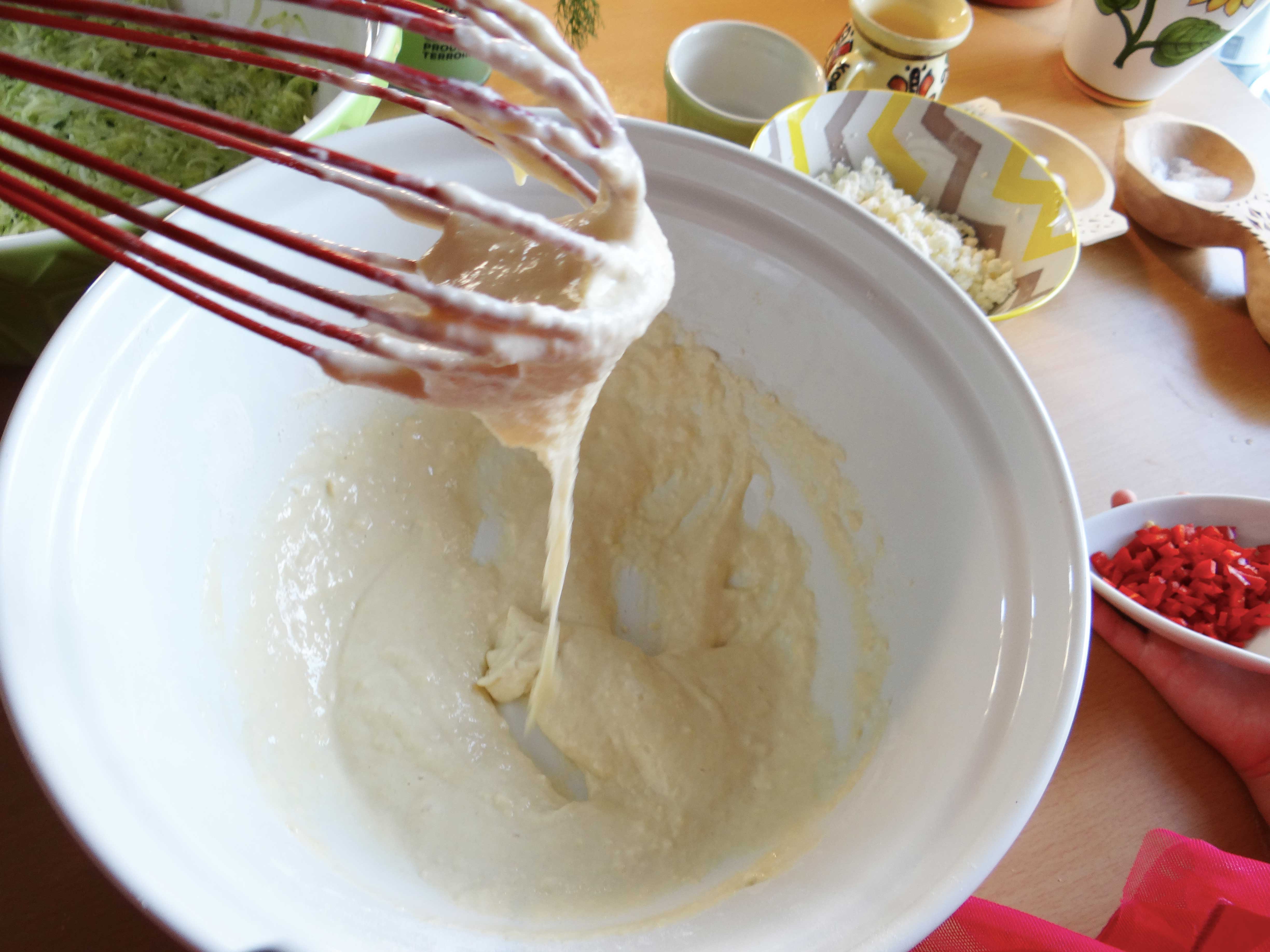 5. Adaugam restul ingredientelor: ardeiul iute, branza, mararul tocat marunt, dovleceii, usturoiul maruntit, piper.