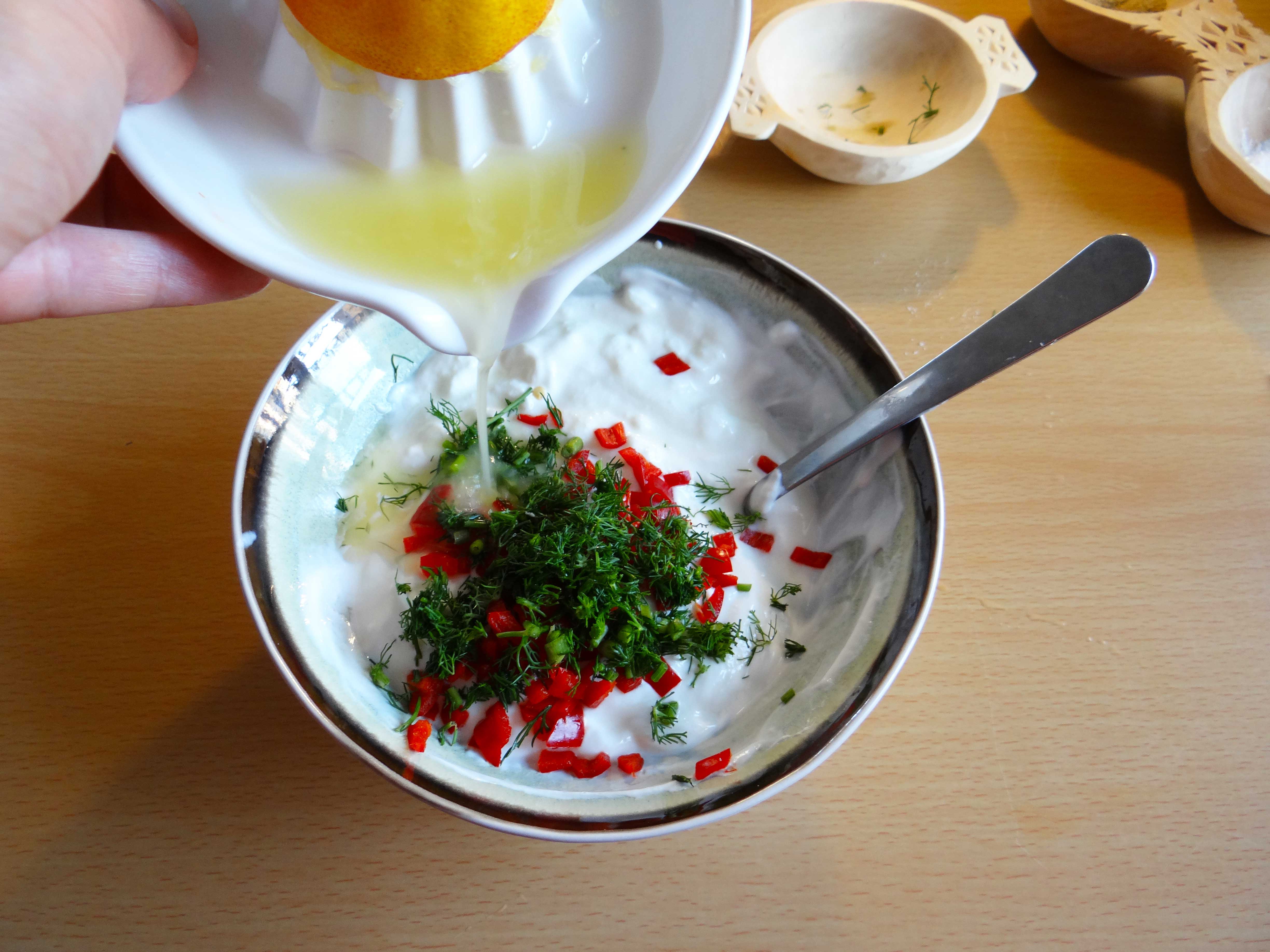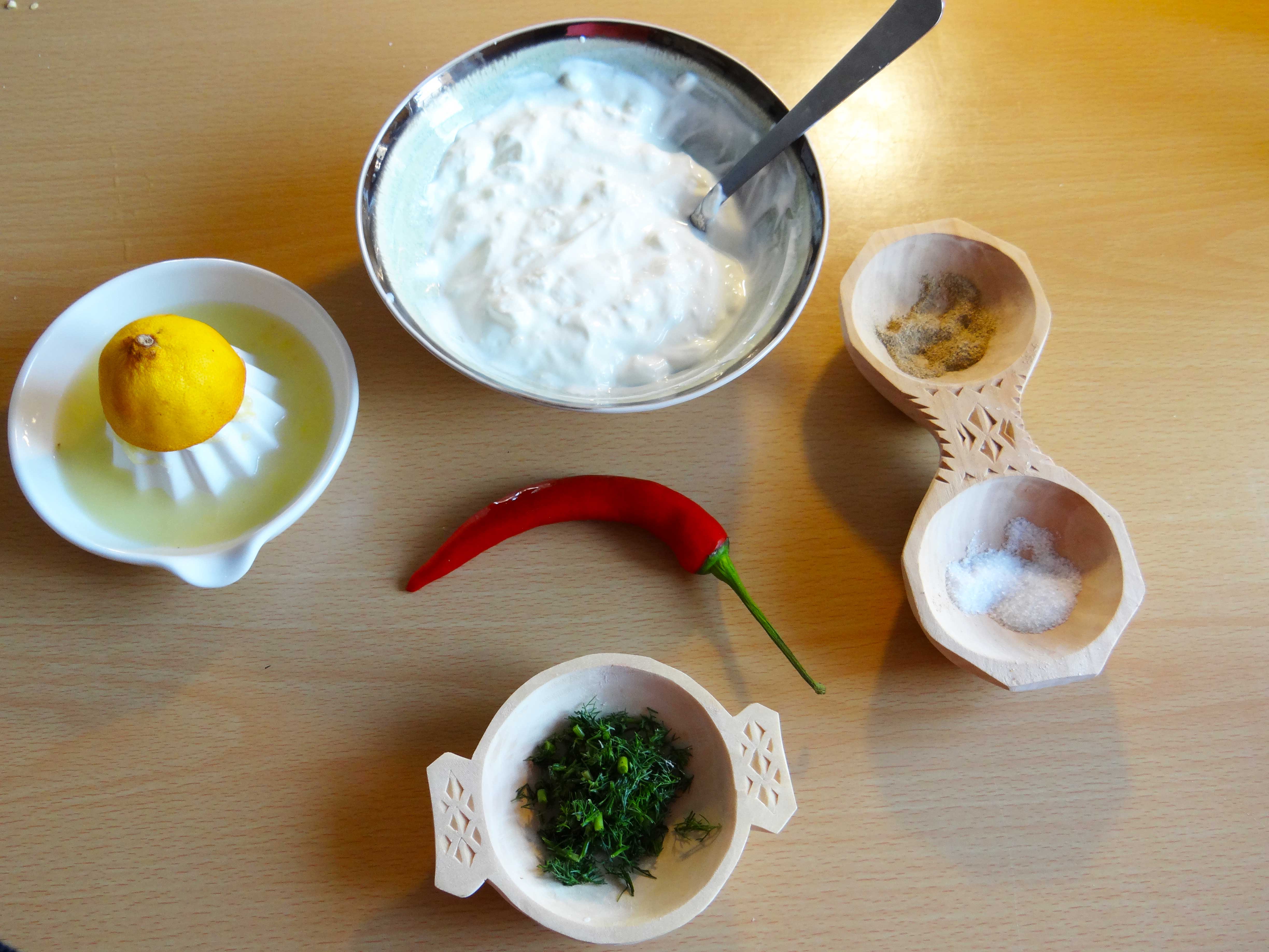 7. Dupa ce am terminat cu chiftelutele ne ocupam de sosul de iaurt. Indepartam semintele ardeiului iute si il taiem in bucati mici. Apoi il adaugam peste iaurt impreuna cu restul ingredientelor. Punem sare si piper dupa gust.