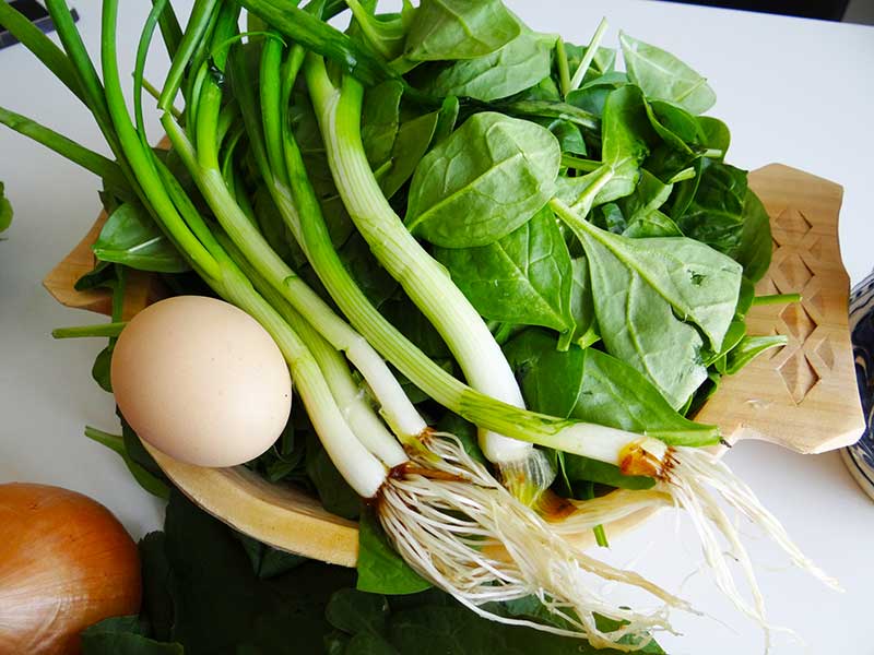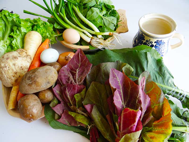 3. Punem uleiul la încins într-o oală de 6L după care adăugăm amestecul de legume tocate. Călim legumele în jur de 3 minute după care le acoperim cu apă. În momentul în care morcovul este fiert adăugăm ștevia tocată mărunt, loboda tăiată, salata tăiată în fâșii, spanacul tăiat și el(dacă folosiți baby spanac nu trebuie să tăiați frunzele).
