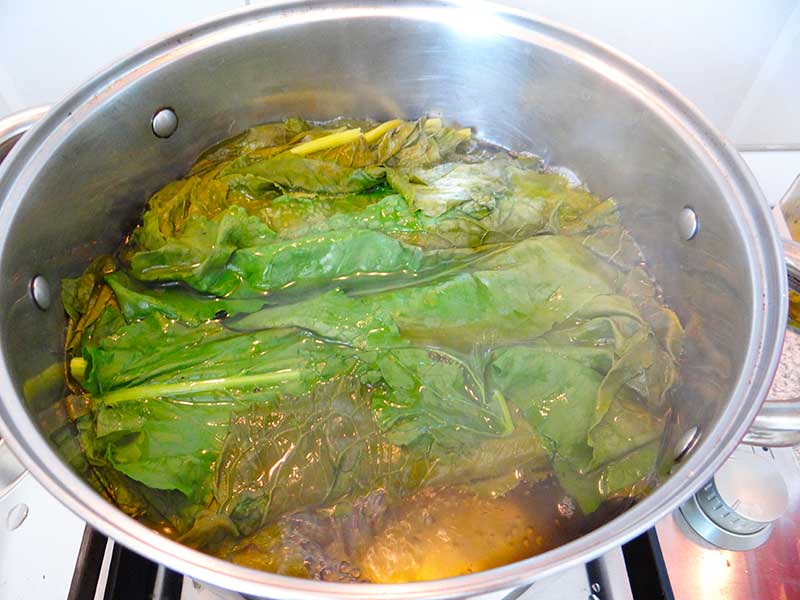 1. Pentru început trebuie să opărim ștevia și pentru a face acest lucru punem o oală cu 2L de apă pe foc, în momentul în care aceasta începe să fiarbă adăugăm frunzele de ștevie cărora le îndepărtăm codițele în prealabil. Scoatem ștevia în momnetul în care aceasta se înmoaie și își schimbă culoarea.