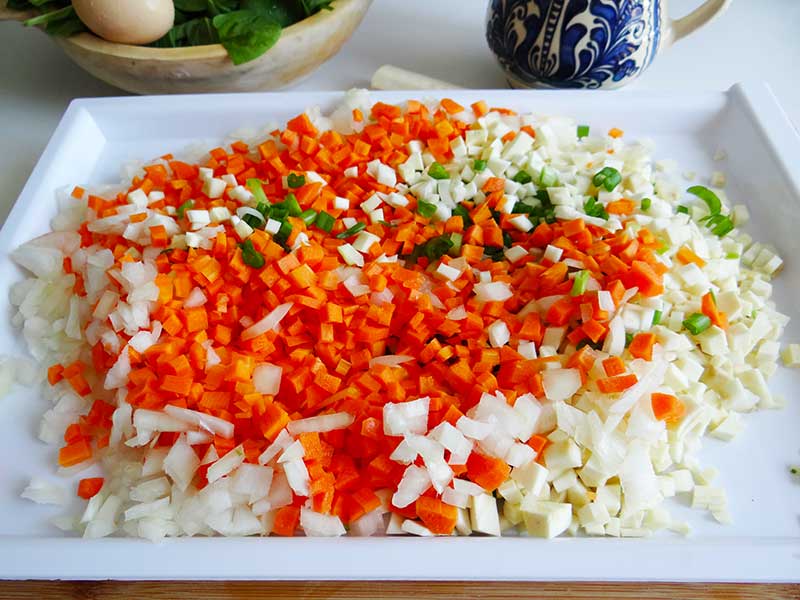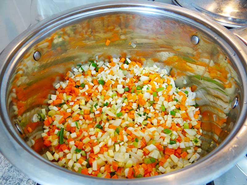 2. Tocăm ceapa galbenă și pe cea verde, morcovii, păstârnacul și țelina.