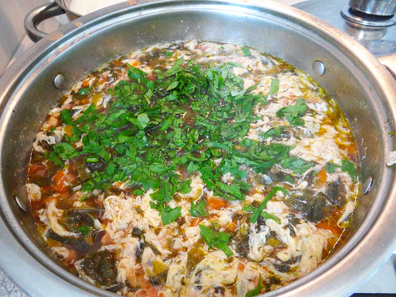 *ouăle bătute se toarnă ușor. Când le turnați trebuie să amestecați în ciorbă cu o furculiță, pentru a forma acele flocoane fine