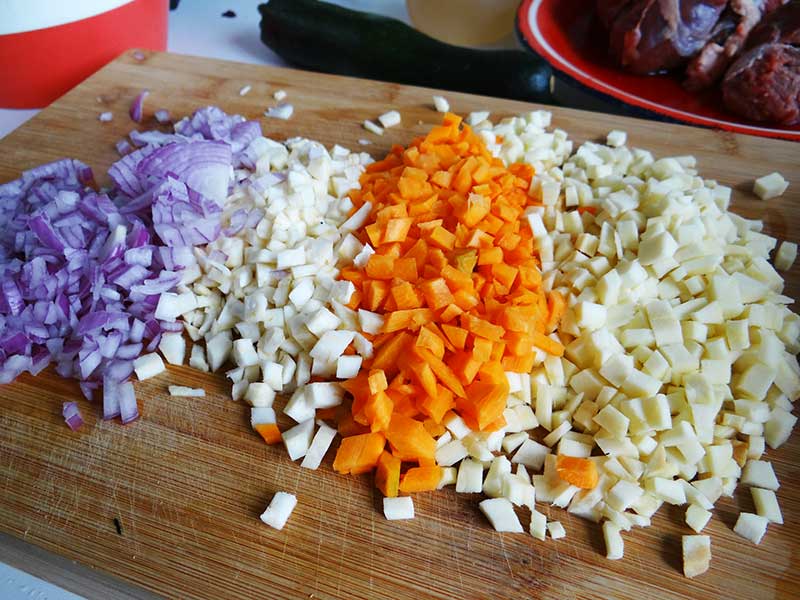 1. Pentru început curățăm și tocăm legumele cubulețe. Începem cu țelina, morcovul păstârnacul și ceapa. Punem orezul la fiert în puțănă apă, cât să-l acopere. Îl fierbem în jur de 3-4 minute după care scurgem apa în care l-am fiert și îl lăsăm la răcit.