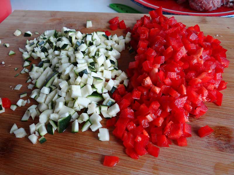 3. Tocăm restul legumelor: dovlecelul, ardeiul capia și roșiile. Acestea din urmă trebuiesc decojite.