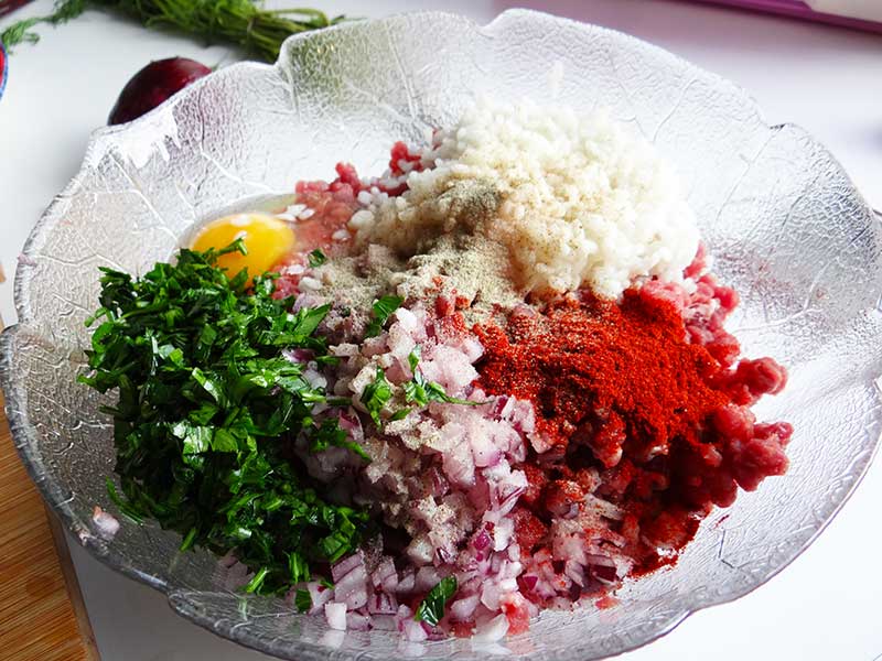 4. În cazul în care folosiți carne macră trebuie să o tocați după care se adaugă restul ingredientelor: ceapa tocată mărunt, orezul fiert, oul, pătrunjelul tocat, sare, piper, boia dulce. Amestecăm toate incredientele cu mâna astfel încât să obținem un amestec omogen.