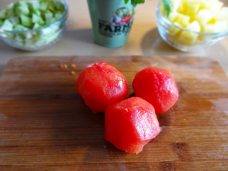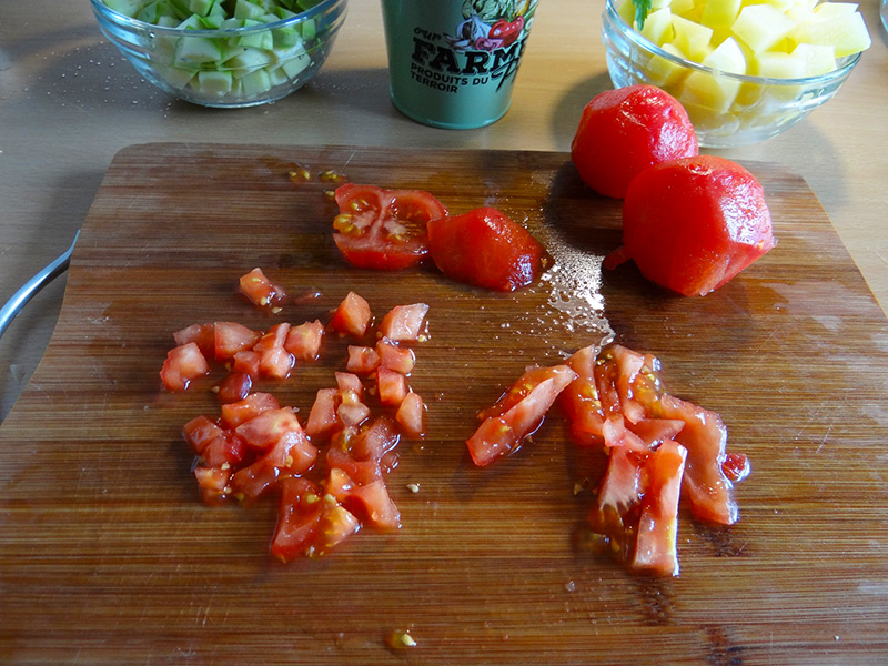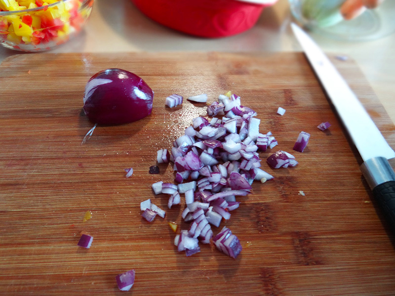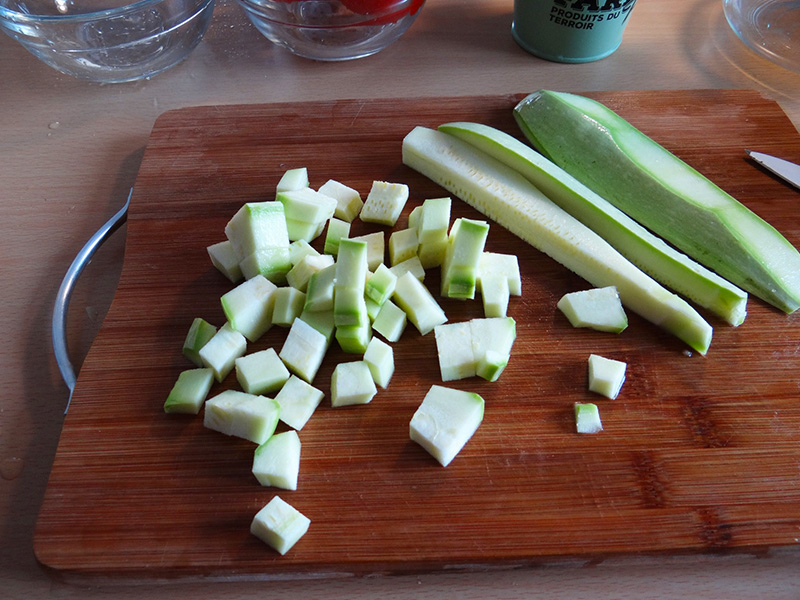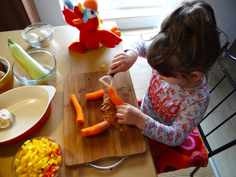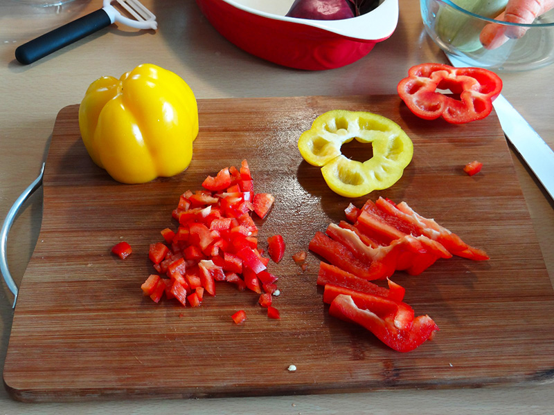 Pana atunci ne ocupam de legume. Curatam de seminte ardeiul si il taiem in bucatele mici.