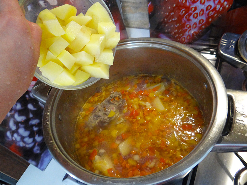 Dupa 15-20 de minute, cand legumele sunt fierte, punem cartofii pe care ii lasam pana devin moi, aproximativ 10 minute.