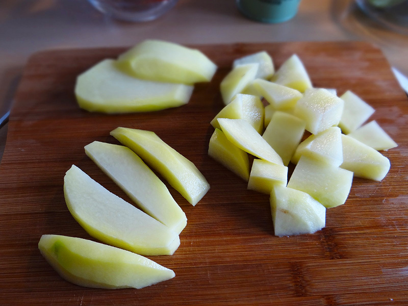 In continuare curatam si taiem cartofii in bucati mai maricele.