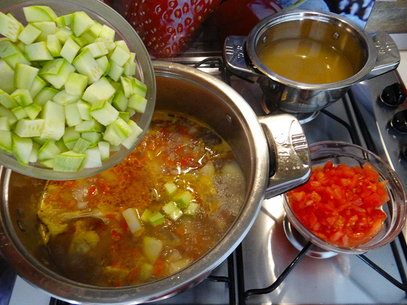 Dupa ce au fiert cartofii punem dovleceii si rosiile si le mai lasam 10 minte, pana cand dovlecelul este fiert.