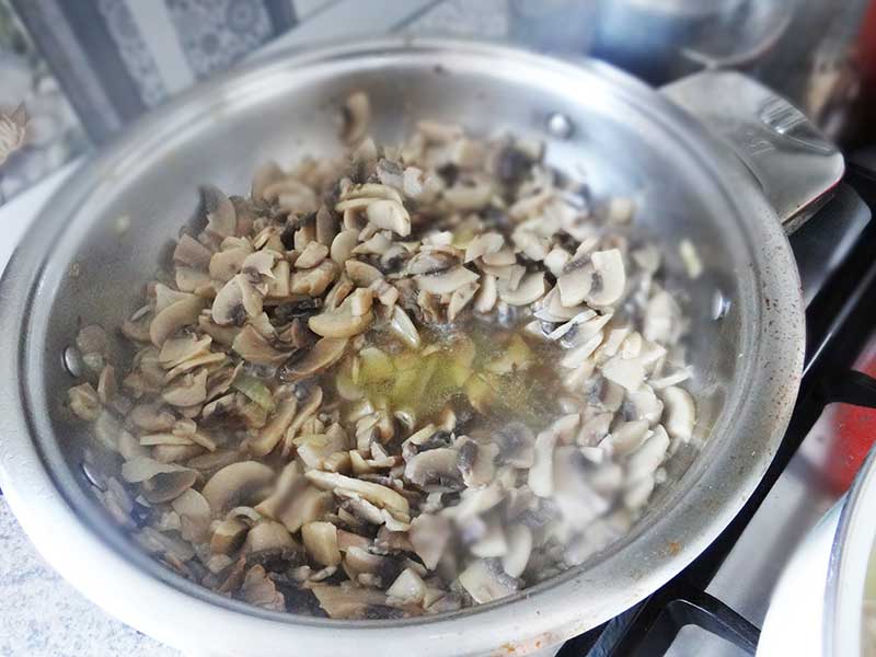 3. Acum trebuie să îngroșăm sosul și pentru a face acest lucru folosim făină sau amidon. Pentru a evita formarea de cocoloașe trebuie să dizolvăm amidonul în prealabil, în puțină apă. Turnăm amidonul dizolvat peste ciuperci, adăugăm și restul de apă după care lăsăm totul să fiarbă, până când sosul se îngroașă. La final adăugăm smântâna.