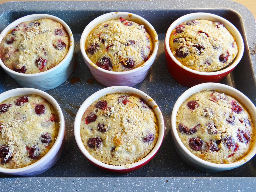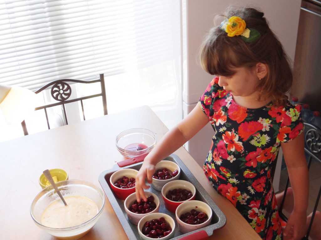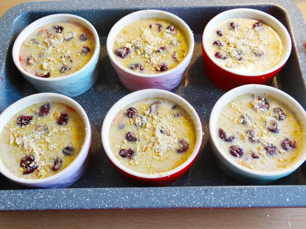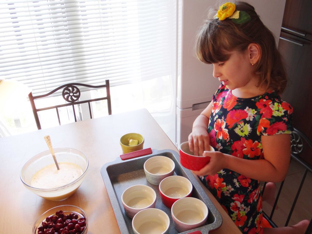 6. Ungem 6 forme Ramekin(diametrul de 10cm) cu unt după care le umplem în mod egal cu vișine.