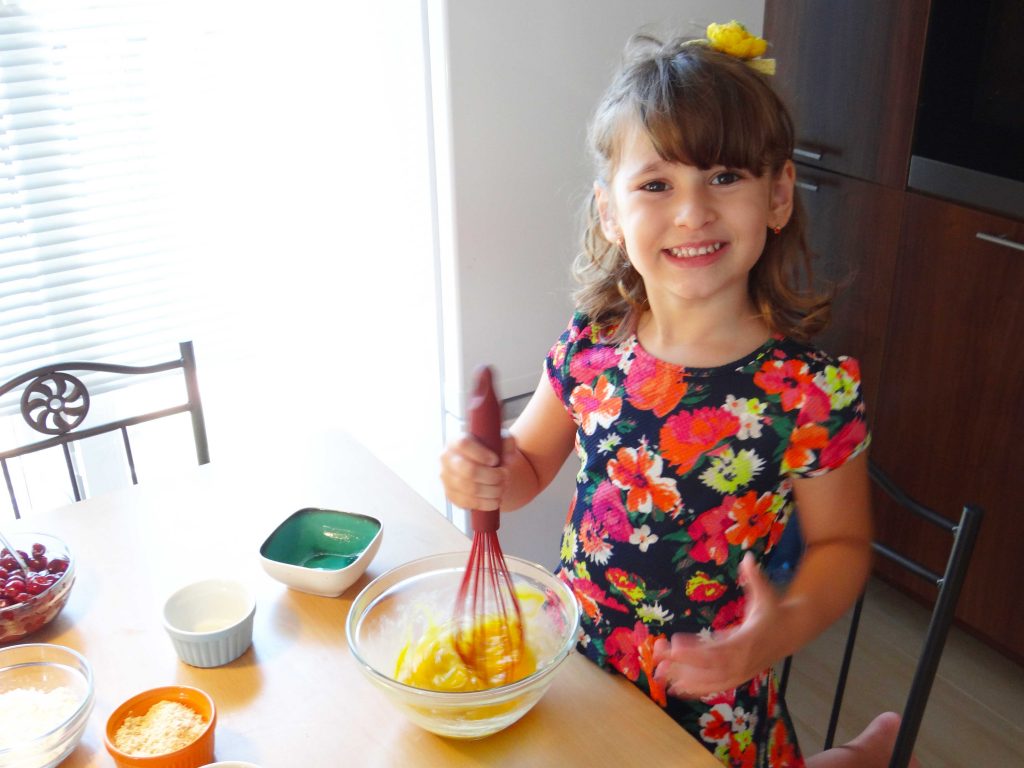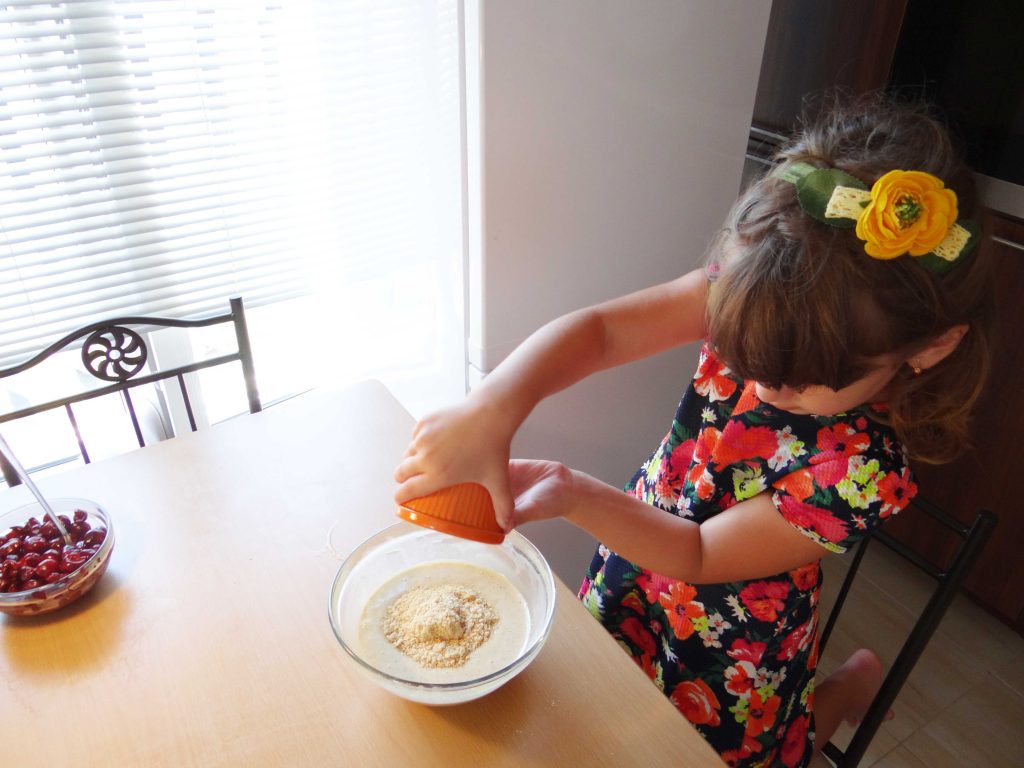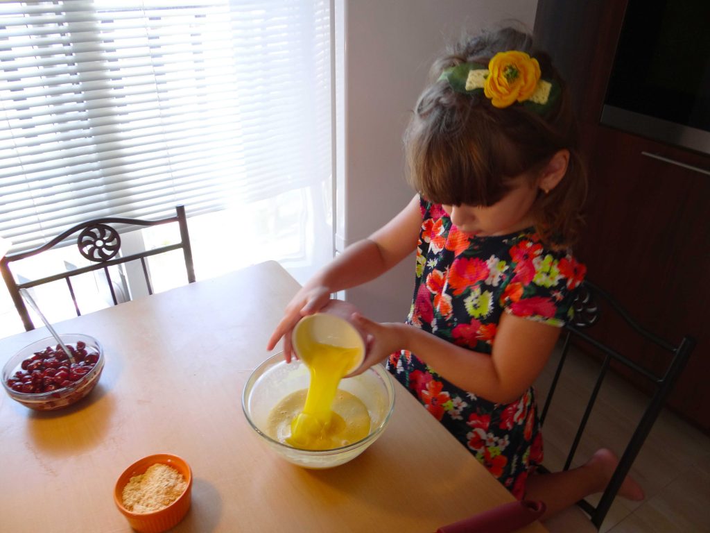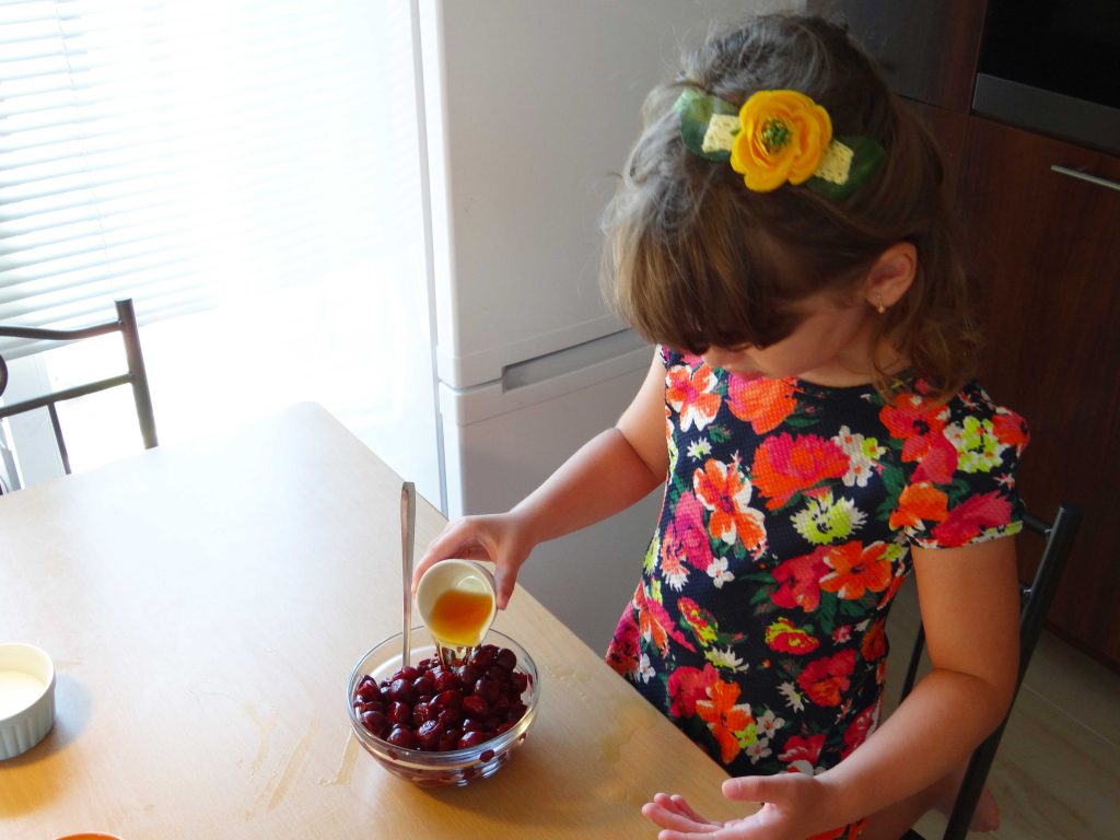 6. Ungem 6 forme Ramekin(diametrul de 10cm) cu unt după care le umplem în mod egal cu vișine.