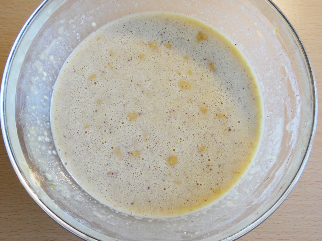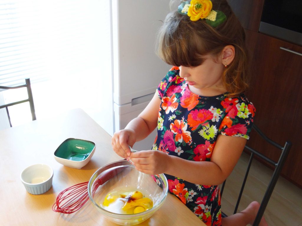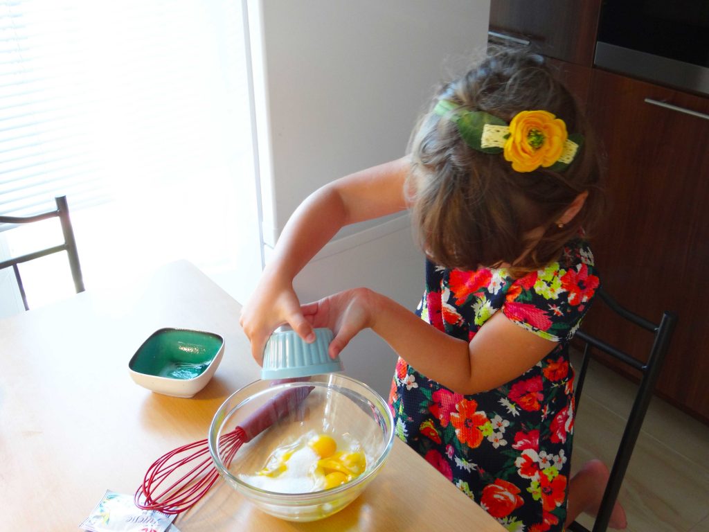 3. Într-un bol înalt amestecăm ouăle cu zahărul și vanilia, apoi adăugăm făina și amestecăm bine.