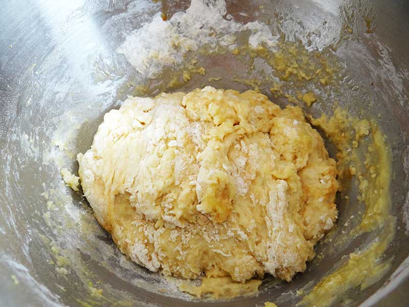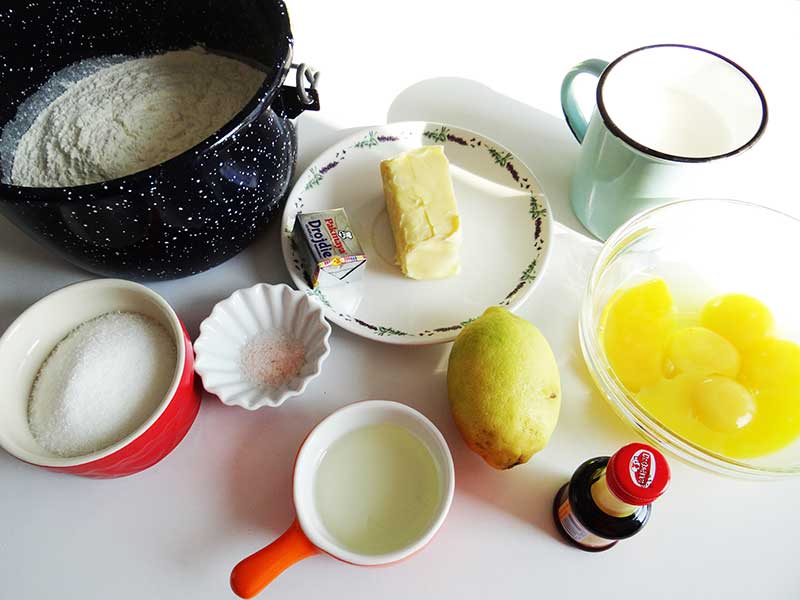 4. Punem făina într-un castron adânc(sau în castronul unui robot de bucătărie), facem o adâncitură în mijloc unde turnăm amestecul nostru. Acum adăugăm și coaja răzuită de lămâie și vanilia. Cu o lingură amestecăm toate ingredientele după care frământăm fie cu mâna fie cu robotul. La final trebuie să obținem un aluat fin și elastic.