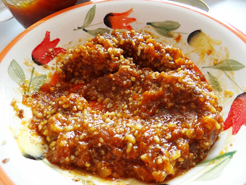 6. Pentru umplutură amestecăm dulceața cu nuca măcinată. Acest amestec nu trebuie să curgă, dacă este nevoie mai adăugați nucă.