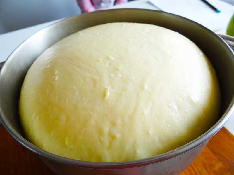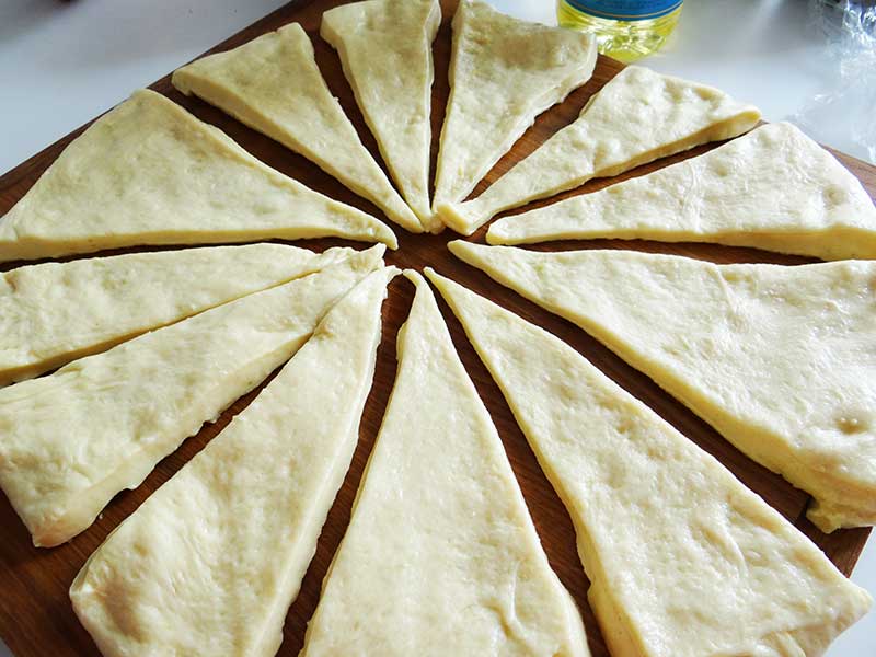 7. După ce a crescut aluatul îl așezăm pe masa de lucru unsă cu ulei și cu ajutorul palmelor îi dăm o formă rotundă cu o grosime de 12cm. Cu un cuțit îl tăiem în 12 bucăți egale, pe cât posibil.