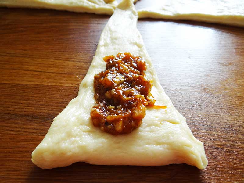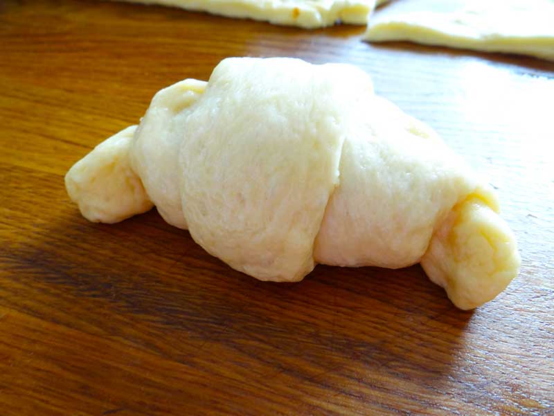 8. Punem o lingură de umplutură după care rulăm pentru a forma cornul.