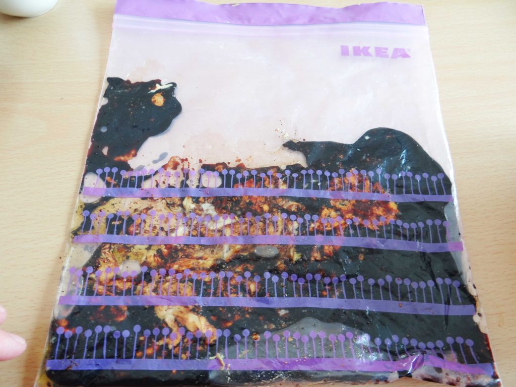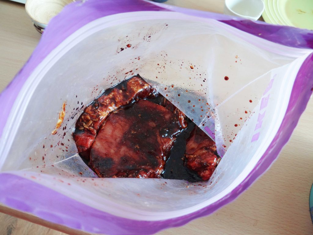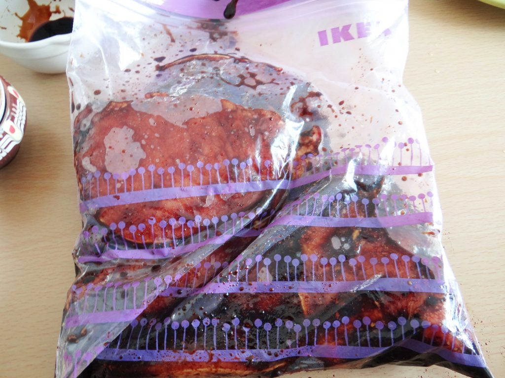 1. Punem sosul de soia, zahărul, piperul, uleiul, usturoiul și muștarul într-o pungă ziplock. Amestecăm bine toate ingredientele după care adăugăm cotletele. Le acoperim pe toate parțile cu marinada după care introducem punga în frigider pentru cel puțin o oră.