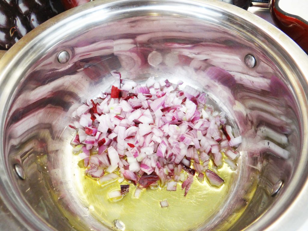 1. Punem uleiul la încins, tocăm ceapa și o călim 2-3 minute.