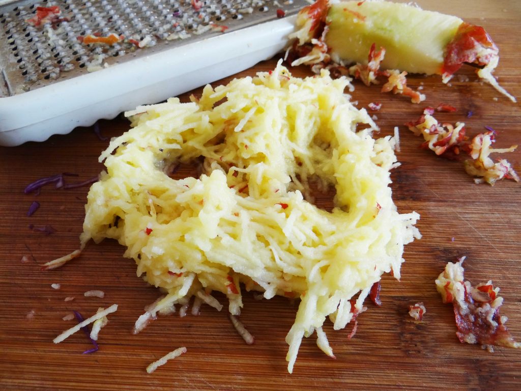 2. Tocăm varza și răzuim mărul cu tot cu coajă.