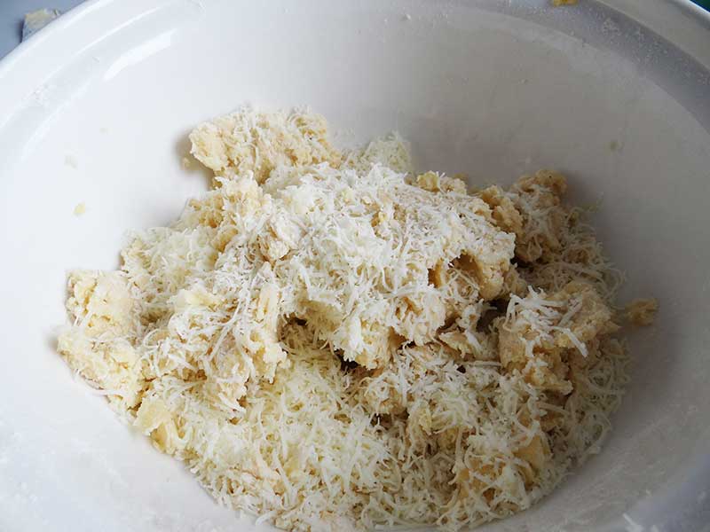 1. Punem toate ingredientele într-un bol, cu excepția cașcavalului, și cu ajutorul mâinii omogenizăm ingredientele. Când aluatul începe să se lege, adăugăm brânza/cașcavalul, și frământăm până când obținem un aluat nelipicios și cu care se poate lucra ușor.