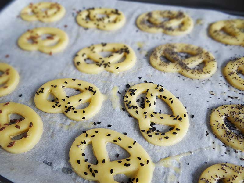 2. Împărțim aluatul în două, lucrăm cu o jumătate iar cealaltă jumătate o ținem în frigider. Presărăm puțină făină pe planul de lucru după care întindem aluatul într-o foaie cu o grosime de 3-4mm. Cu ajutorul unei forme pentru covrigei formăm covrigeii pe care îi așezăm apoi într-o tavă tapetată cu hârtie de copt.
