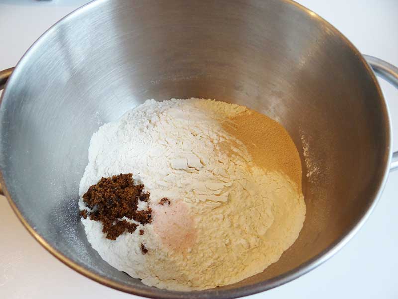 1. În bolul unui robot punem făina împreună cu sarea, zahărul și drojdia.