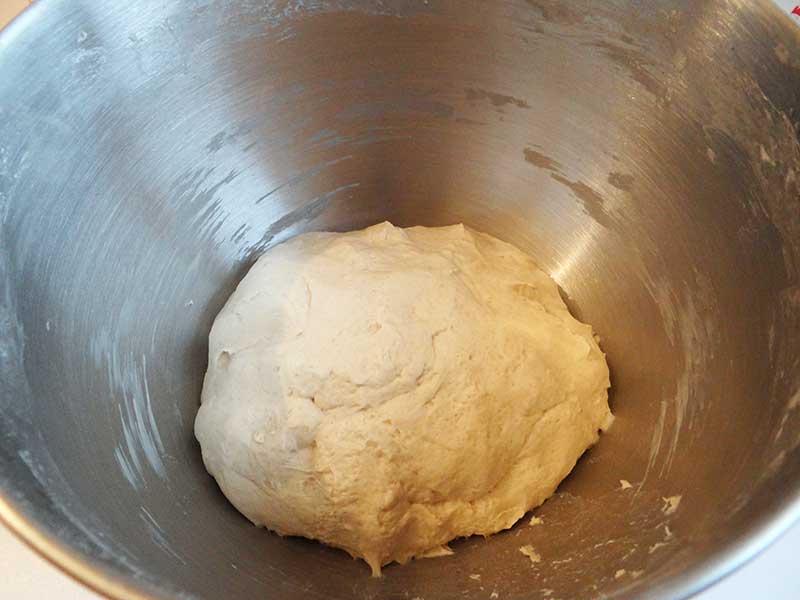 Frământăm aluatul cam 10 minute, până devine elastic și nelipicios. Lăsăm aluatul la dospit, într-un loc călduros, pentru 1-2 ore(trebuie să-și dubleze volumul).