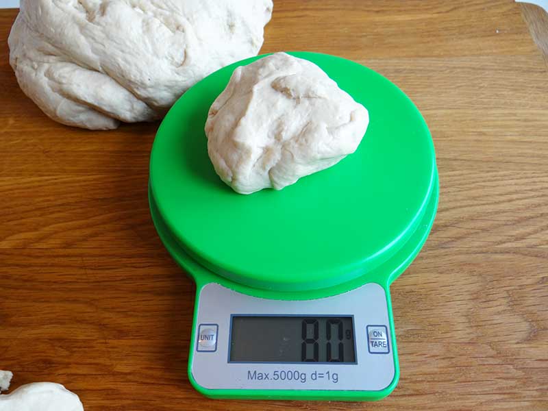 3. Punem aluatul pe masa de lucru, pe care am pus în prealabil puțin ulei. Divizăm aluatul în porțiuni de 80g.