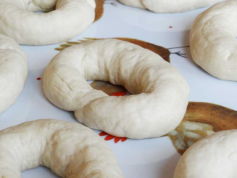 5. Unim ambele capete ale sulului și astfel am format covrigul. Așezăm covrigii pe o tavă, îi acoperim cu folie de plastic și îi lăsăm la dospit 30 de minute.