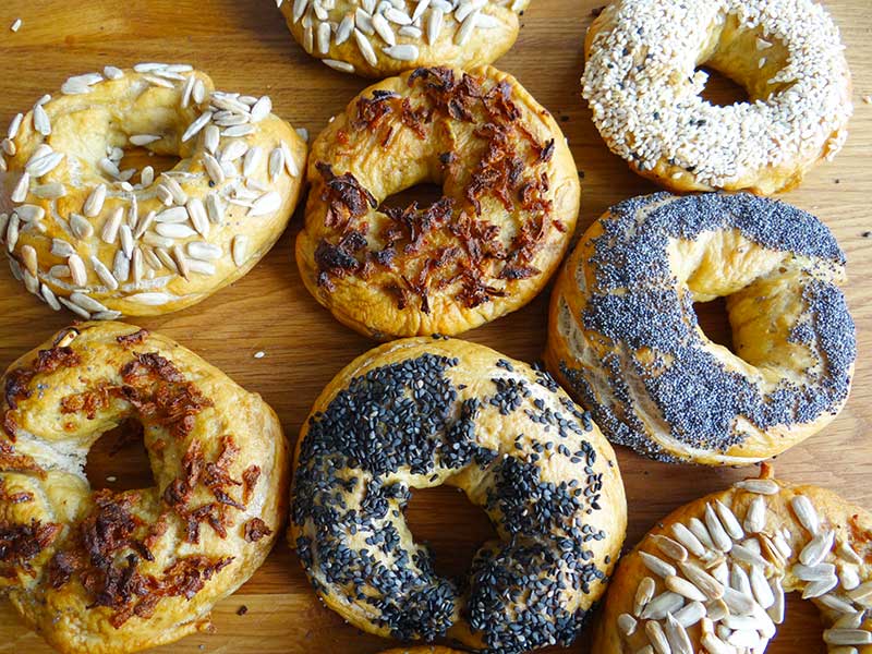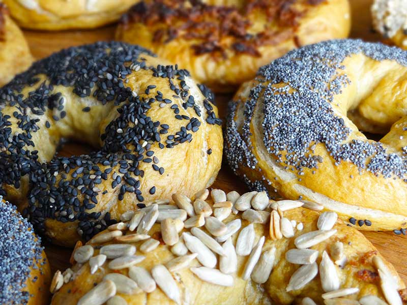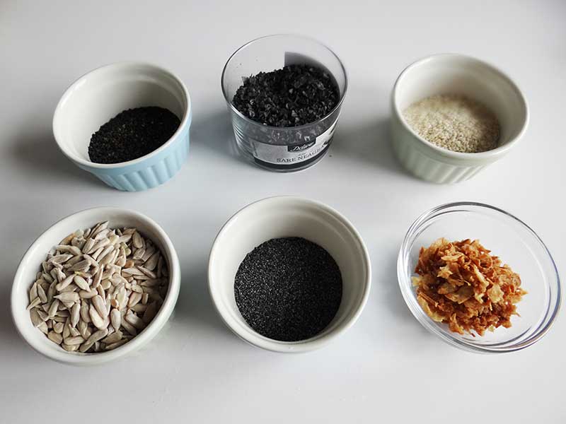Semințe de mac, susan alb și negru, semințe de floarea soarelui, fulgi de ceapă prăjită, sare neagră.