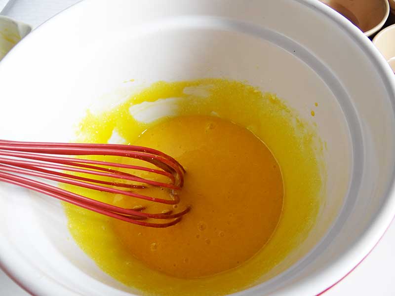 6. În momentul în care smântâna s-a încălzit o turnăm în fir subțire peste amestecul de gălbenușuri. În tot acest timp amestecăm foarte bine cu un tel.