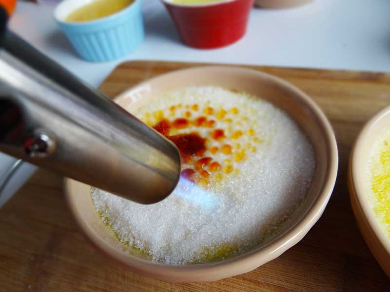 Înainte de a le consuma presărăm zahăr tos deasupra cremei după care, cu ajutorul unei torțe, le flambăm.