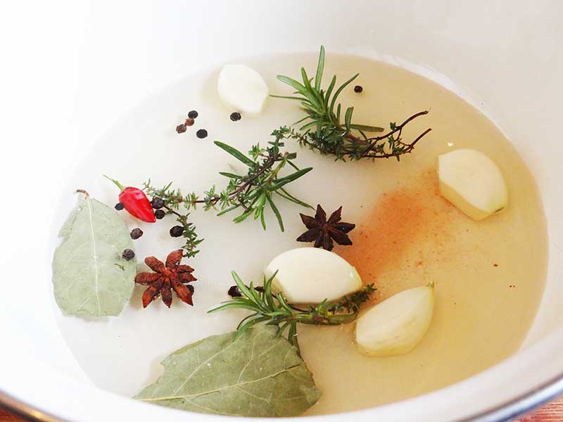 2. Punem la fiert vinul, oțetul, zahărul, sarea, usturoiul și condimentele. Le fierbem în jur de 2-3 minute.