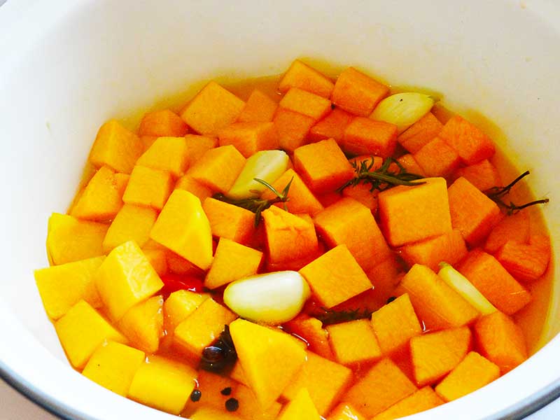 3. Adăugăm dovleacul și mai fierbem totul 3 minute.