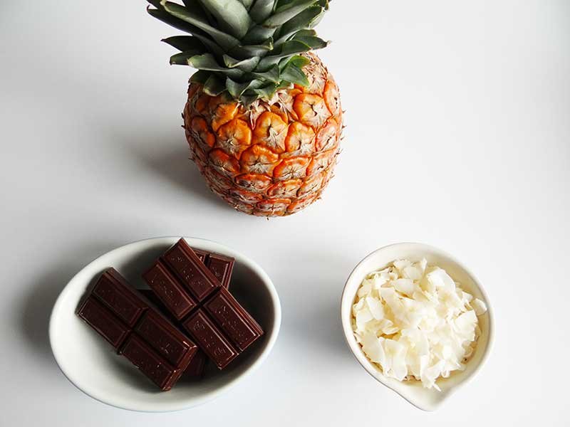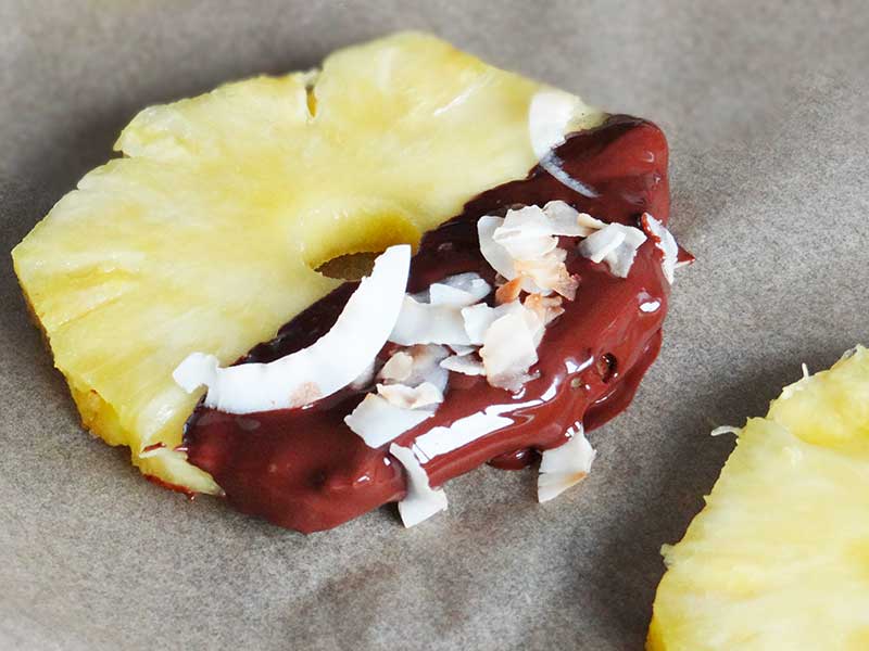 5. Așezăm feliile de ananas într-o tavă tapetată cu hârtie de copt. Deasupra ciocolatei presărăm fulgi de cocos. Lasăm feliile de ananas în tavă până când ciocolata se întărește.