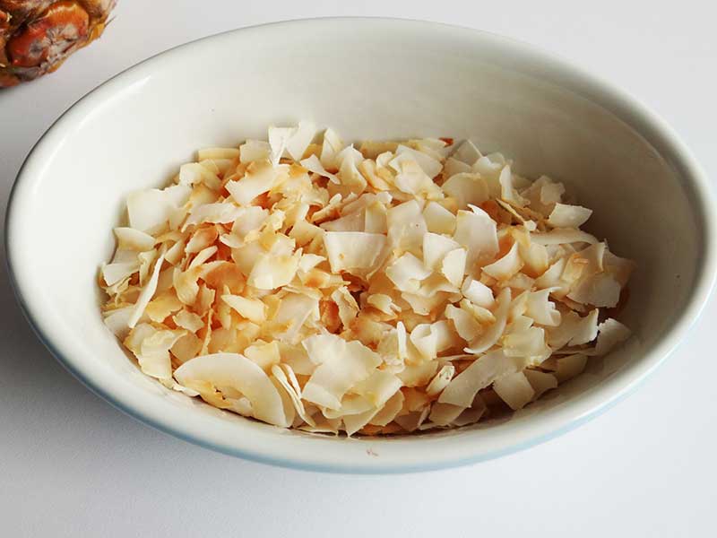 1. Prăjim fulgii de cocos într-o tigaie antiaderentă.