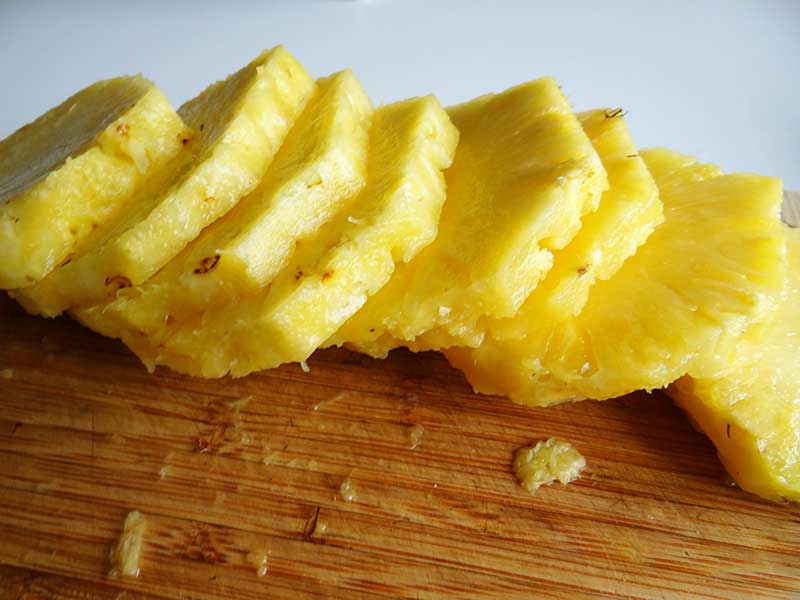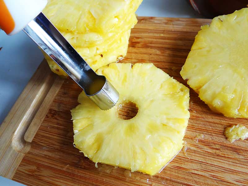 3. Curățăm și tăiem ananasul în felii cu o grosime de 1cm. Îndepărtăm centrul dur al feliilor de ananas.