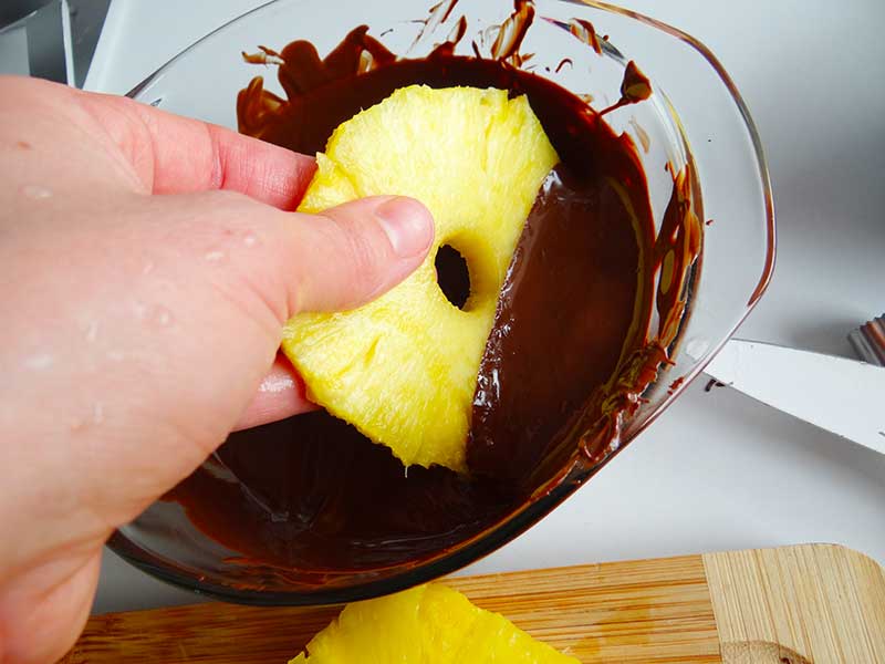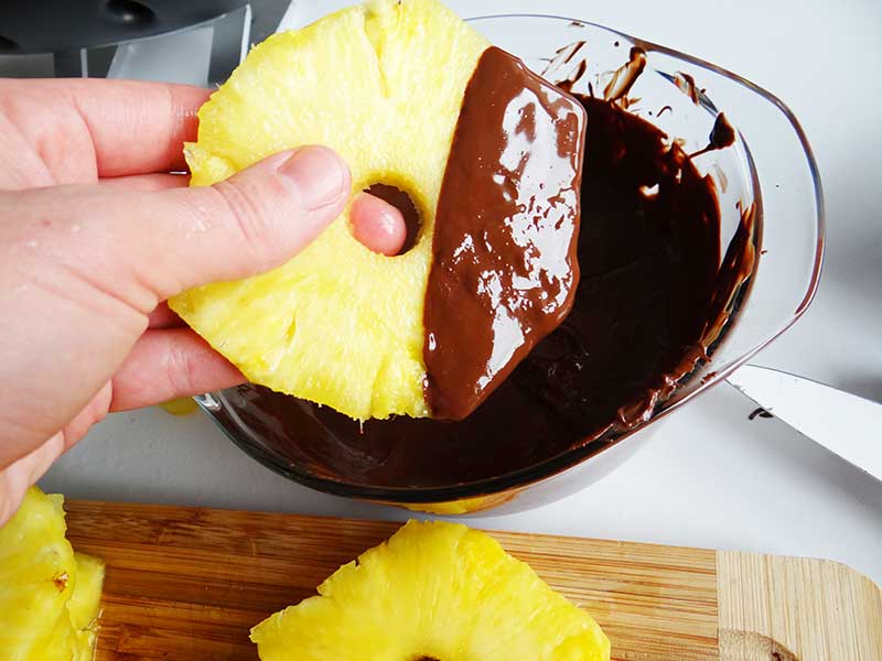 4. Introducem feliile de ananas în ciocolata topită. Înainte de a face acest lucru trebuie să ștergem cu hârtie de bucătărie porțiunea pe care o vom introduce în ciocolată.