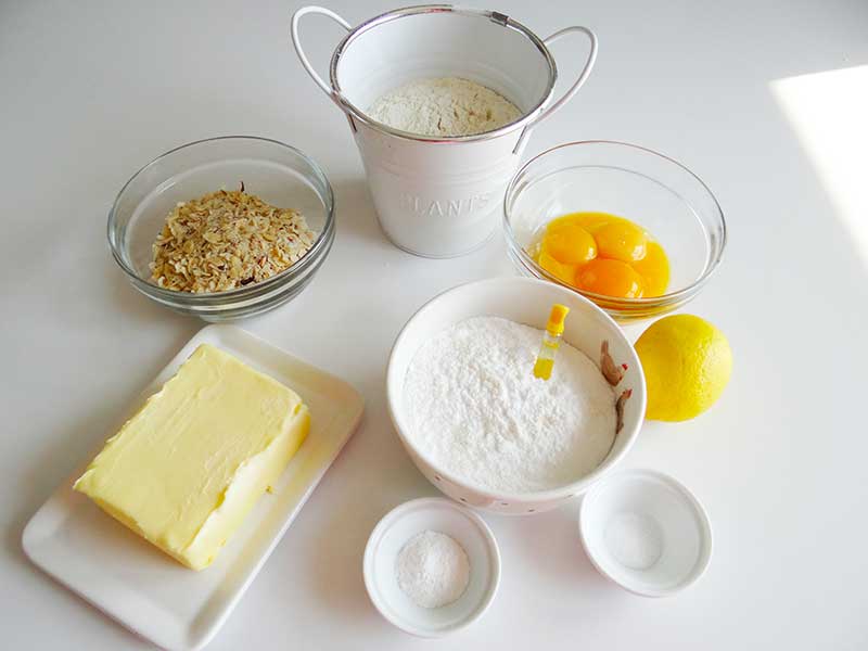 1. Mixăm untul cu zahărul pudră pe care îl adăugăm treptat, câte o lingură odată. Trebuie să obținem un amestec pufos și deschis la culoare. Apoi adăugăm gălbenușurile, unul câte unul. Urmează vanilia, coaja răzuită de lămâie și sarea. La final adăugăm făina împreună cu praful de copt și nucile măcinate.