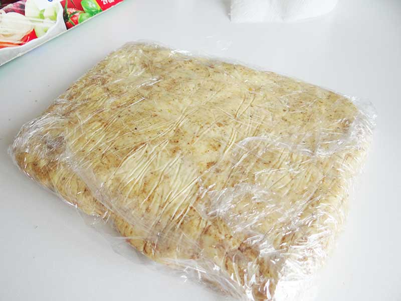 Străngem aluatul cu mâinile și îi dăm o formă dreptunghiulară. Învelim aluatul în folie alimentară și îl introducem în frigider pentru 1 oră.