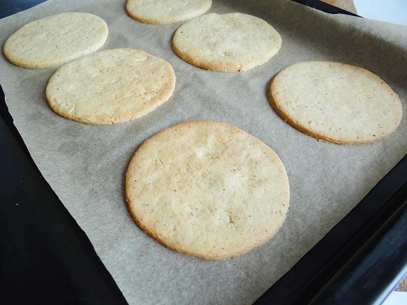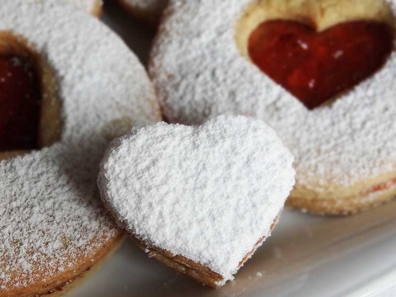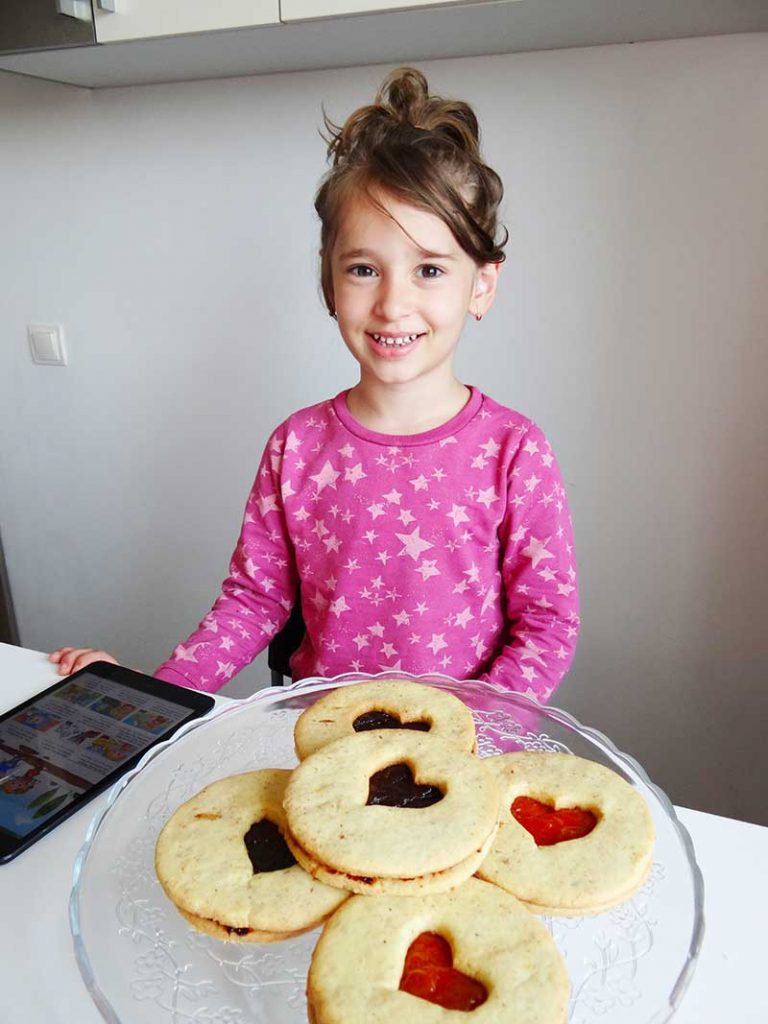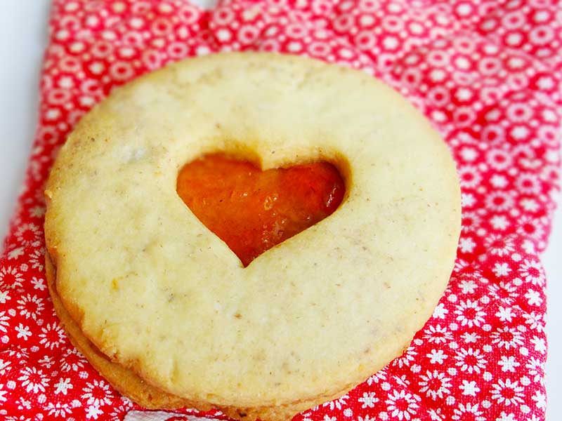 Cu ajutorul unei forme rotunde cu diametrul de 10cm decupăm aluatul. Cercurile rezultate le așezăm într-o tavă tapetată cu hârtie de copt după care decupăm cu o formă de inimioară. Lăsăm un cerc întreg iar pe unul îl decupăm.