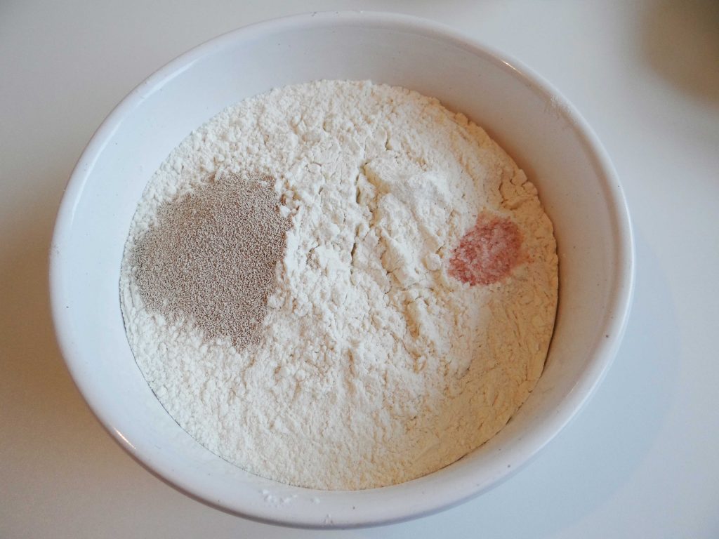1. Adăugăm drojdia și sarea peste făină(în locuri diferite deoarece sarea nu trebuie să intre în contact direct cu drojdia) după care amestecăm totul bine.
