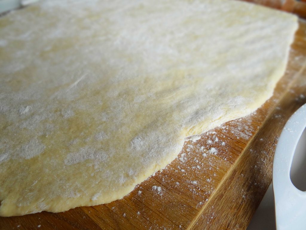 5. Punem aluatul pe masa de lucru pe care am presărat făină în prealabil, adăugăm făină și deasupra aluatului și apoi îl intindem cu sucitorul.