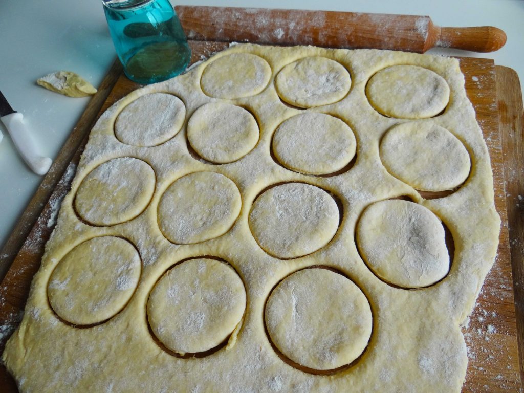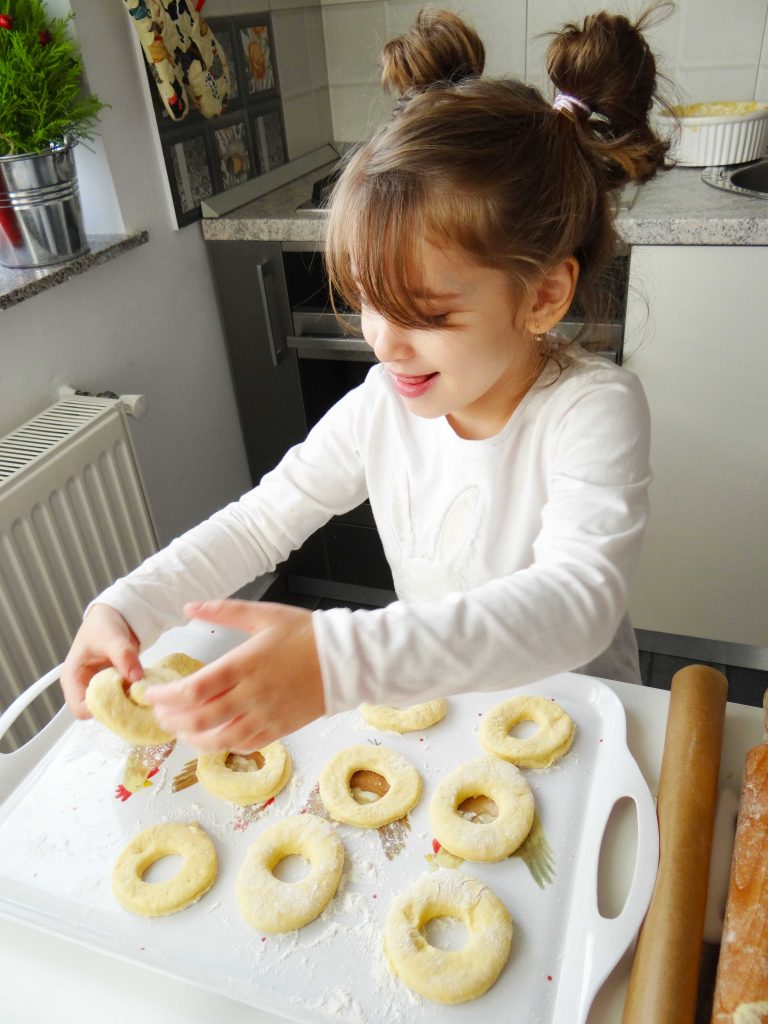 Decupăm cerculețe din aluat(eu am folosit un pahar) pe care le așezăm apoi într-o tavă tapetată cu hârtie de copt. Peste hârtia de copt presărăm puțină făină. Gogoșile care nu au încăput în tava cuptorului le-am pus pe o tavă mare de plastic.