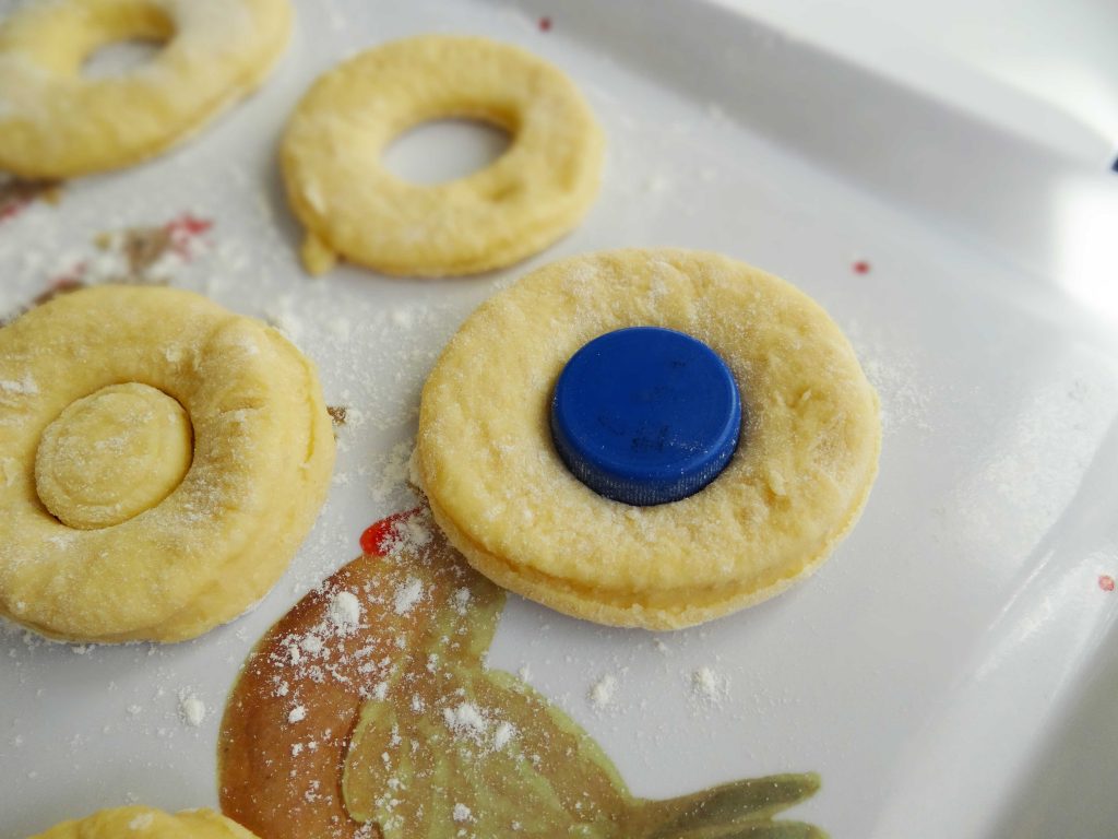 Apoi cu ajutorul unui cerculeț mai mic decupăm centrul gogoșii(eu am folosit un capac de plastic).