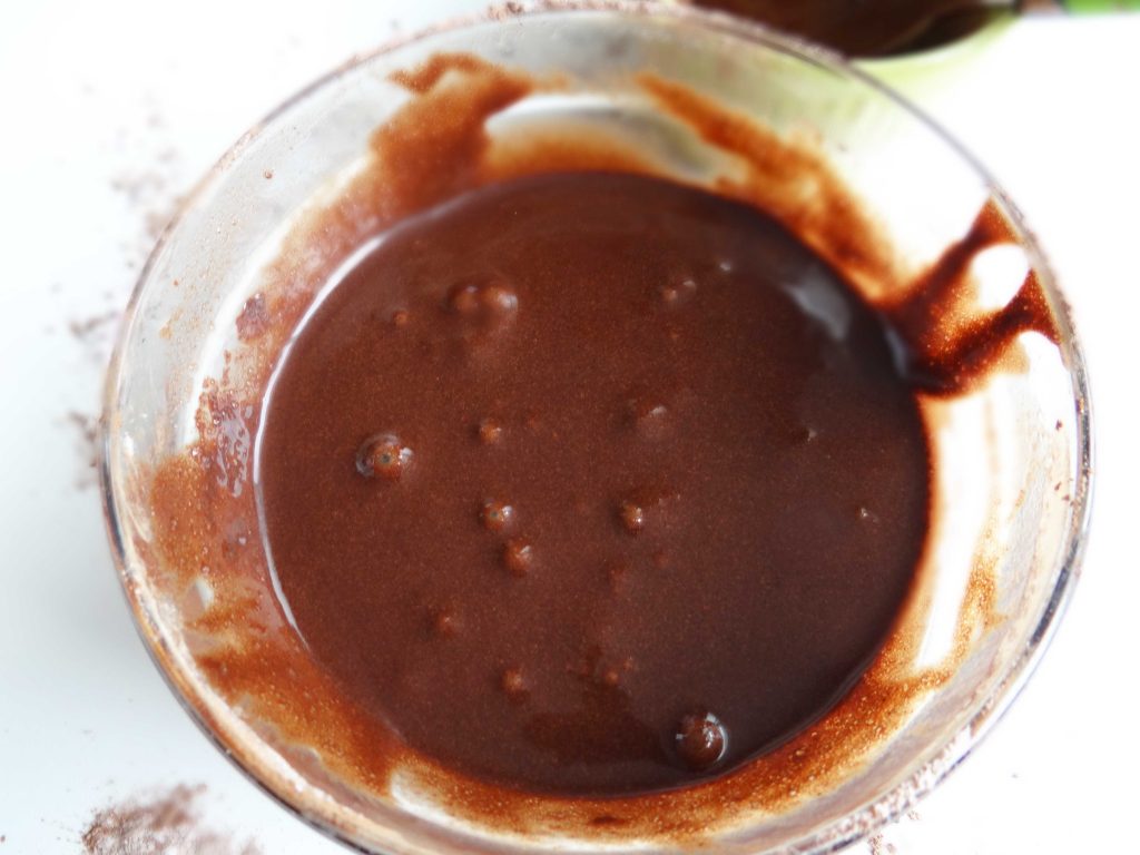 Adăugăm cacaoa peste zahăr, apoi punem puțin câte puțin lapte și amestecăm bine. Glazura trebuie sa fie groasă dar să și curgă în același timp.