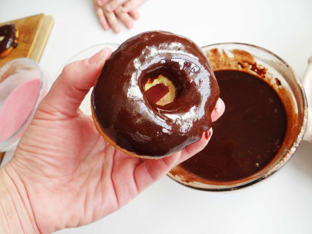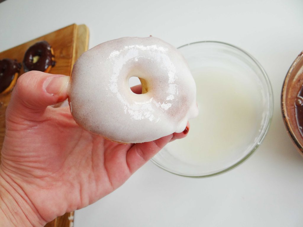 Cum facem asta? Pur și simplu luăm o gogoașă în mână și o introducem în glazură, o ridicăm puțin în sus și o ținem câteva secunde așa pentru a se scurge excesul de glazură. Apoi o așezăm pe un grătar/tocător de lemn și presărăm deasupra toppingul.
